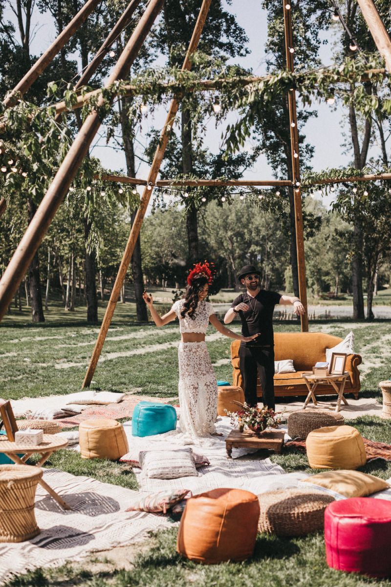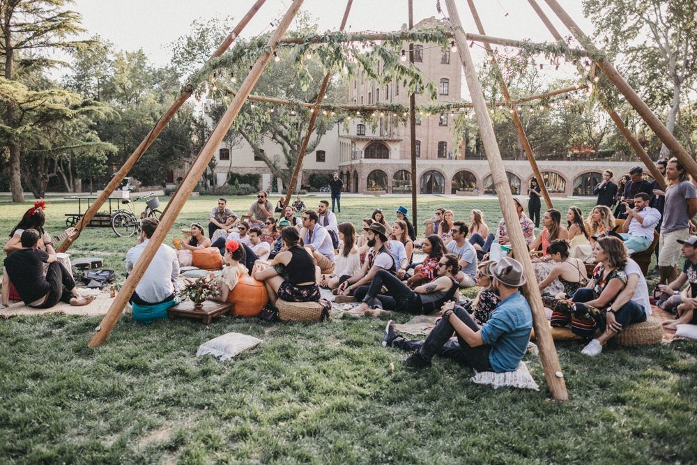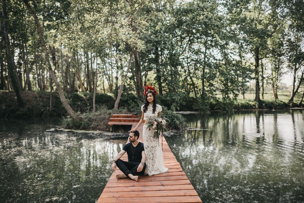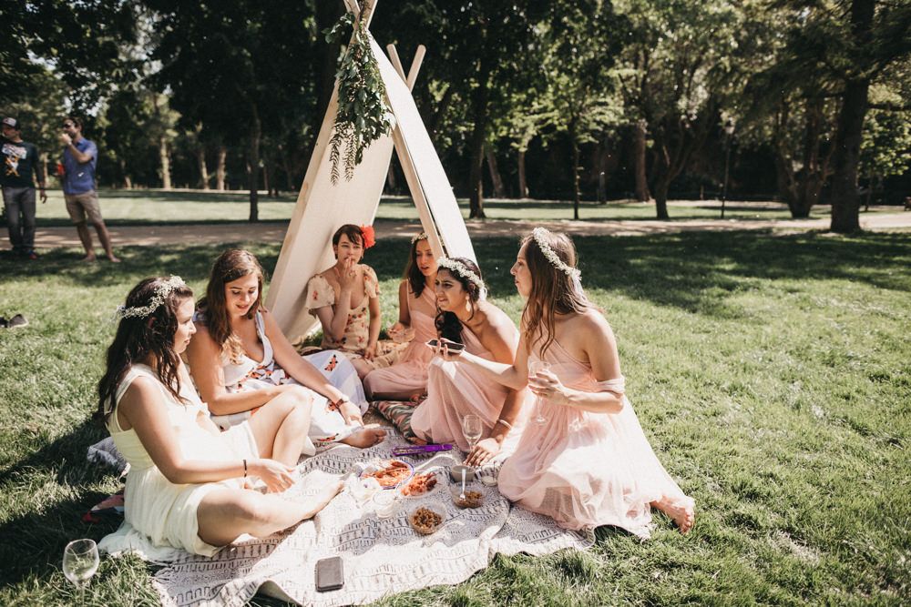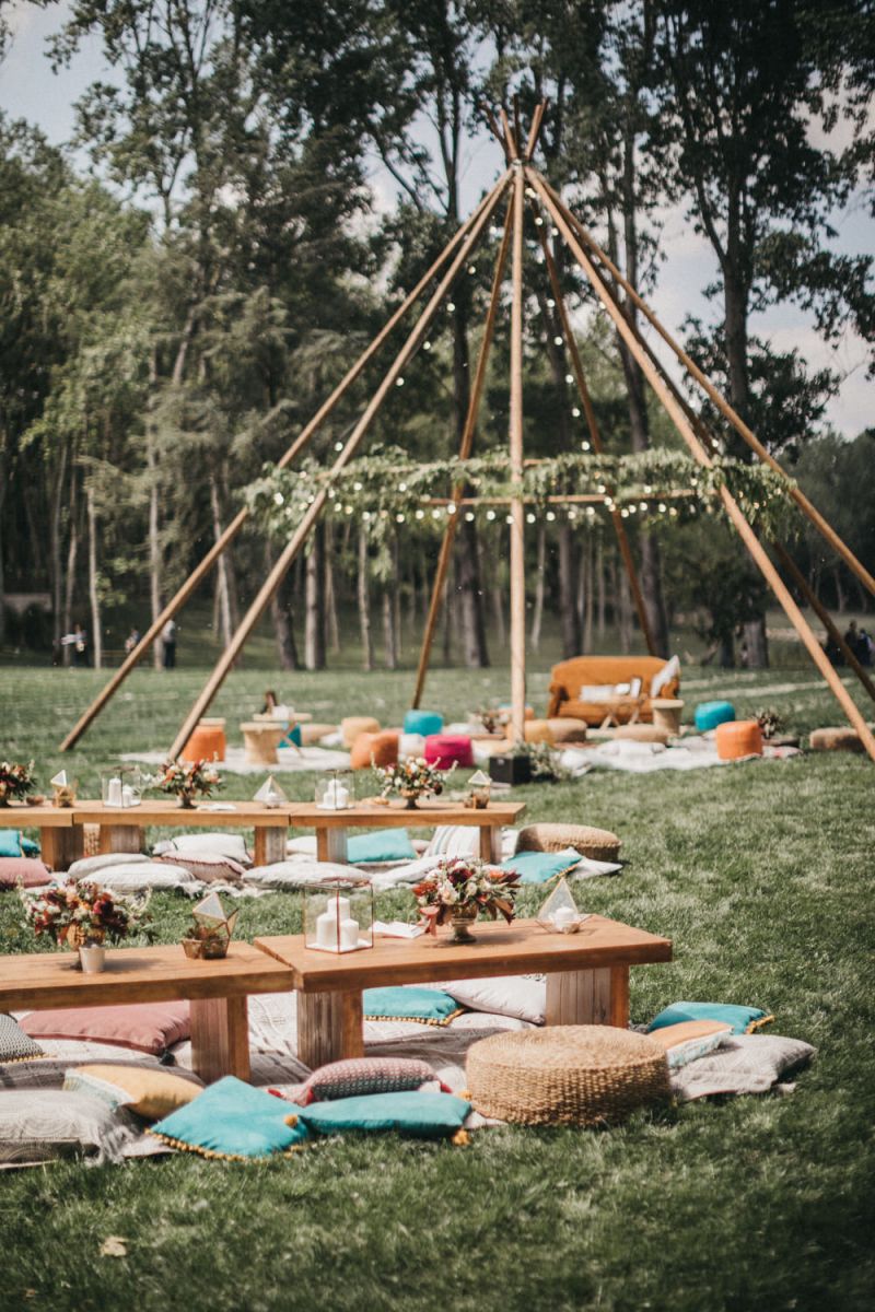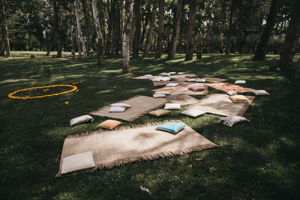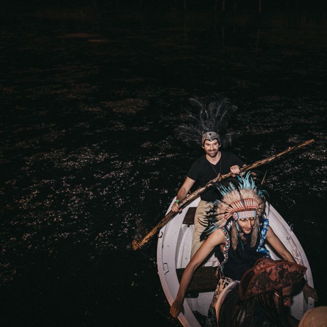 Our wedding was inspired by Burning Man Festival, with the details of the day having a marked boho character. The ceremony/ritual took place in the middle of a large mandala by the lake, our guests relaxed at low tables with carpets and cushions on the floor, a mural was made between the trees to paint with spray, and at the heart of the celebrations was a naked tipi in which to sing and play instruments. Burgundy colours, feathers and minerals dominated the décor. There was a short break between the day and evening festivities and, at night, guests became Indians and animals for dinner and dancing to our five DJs.