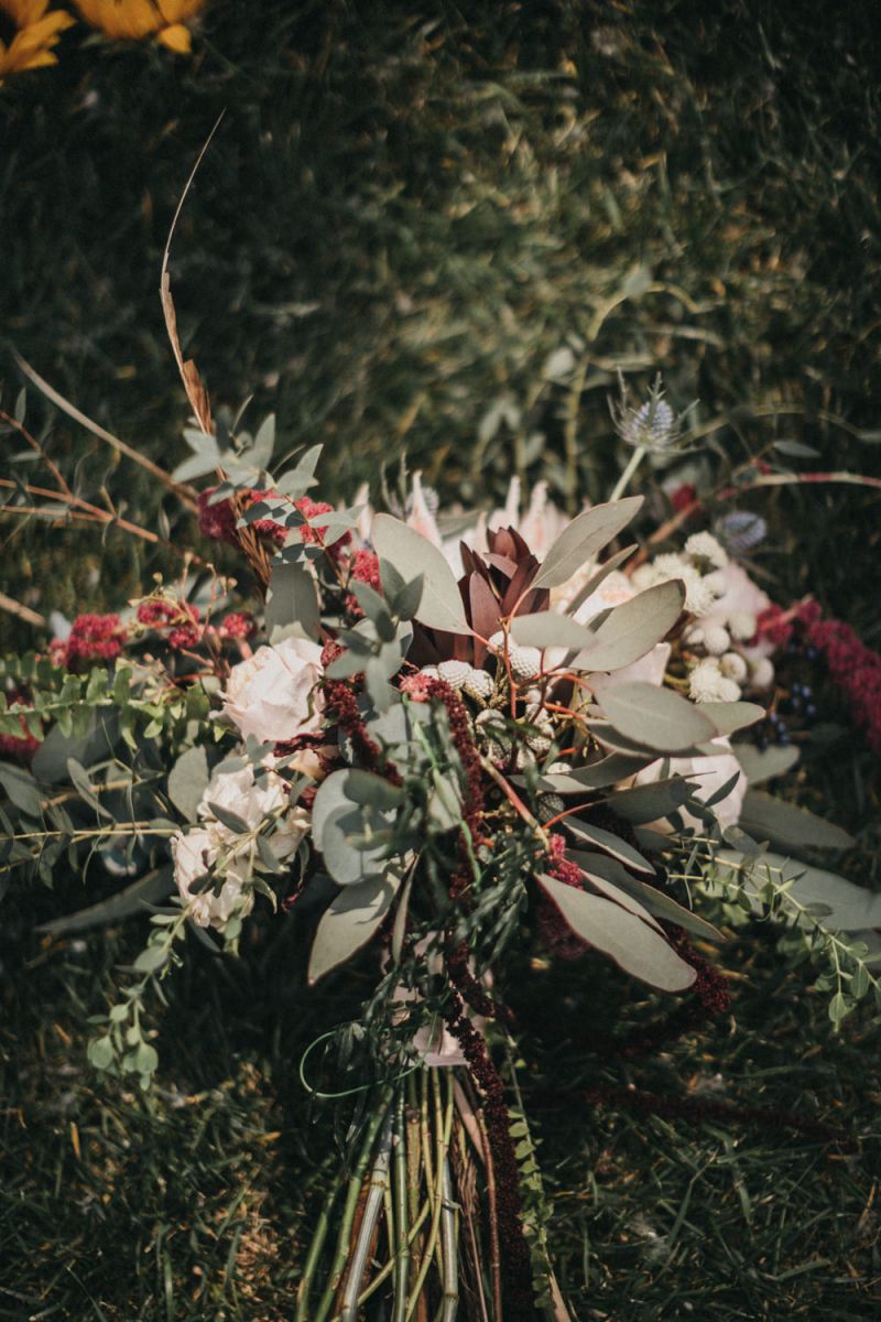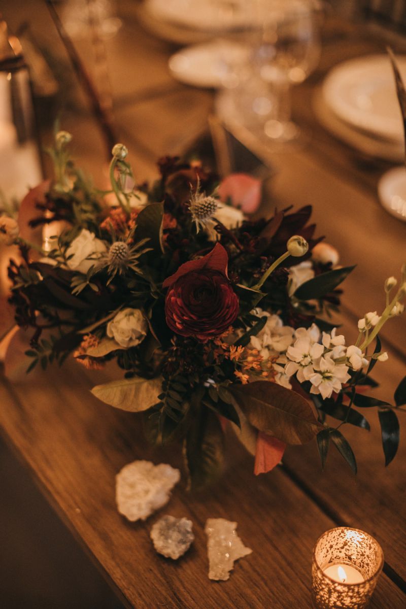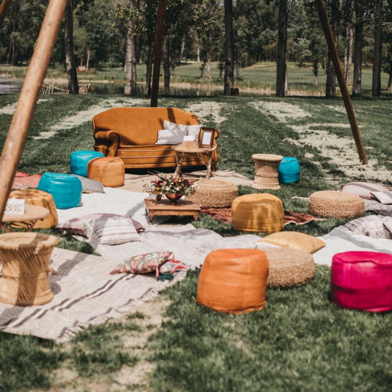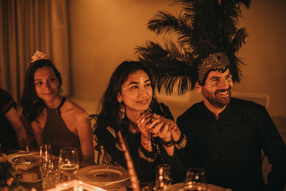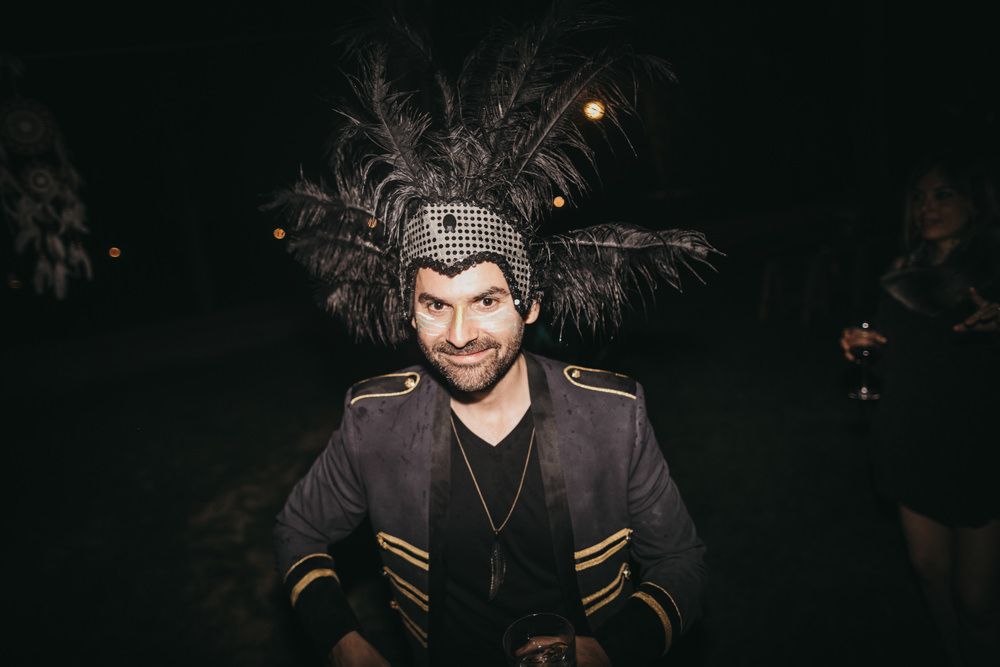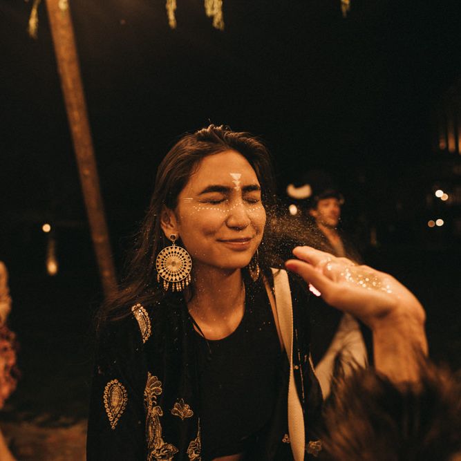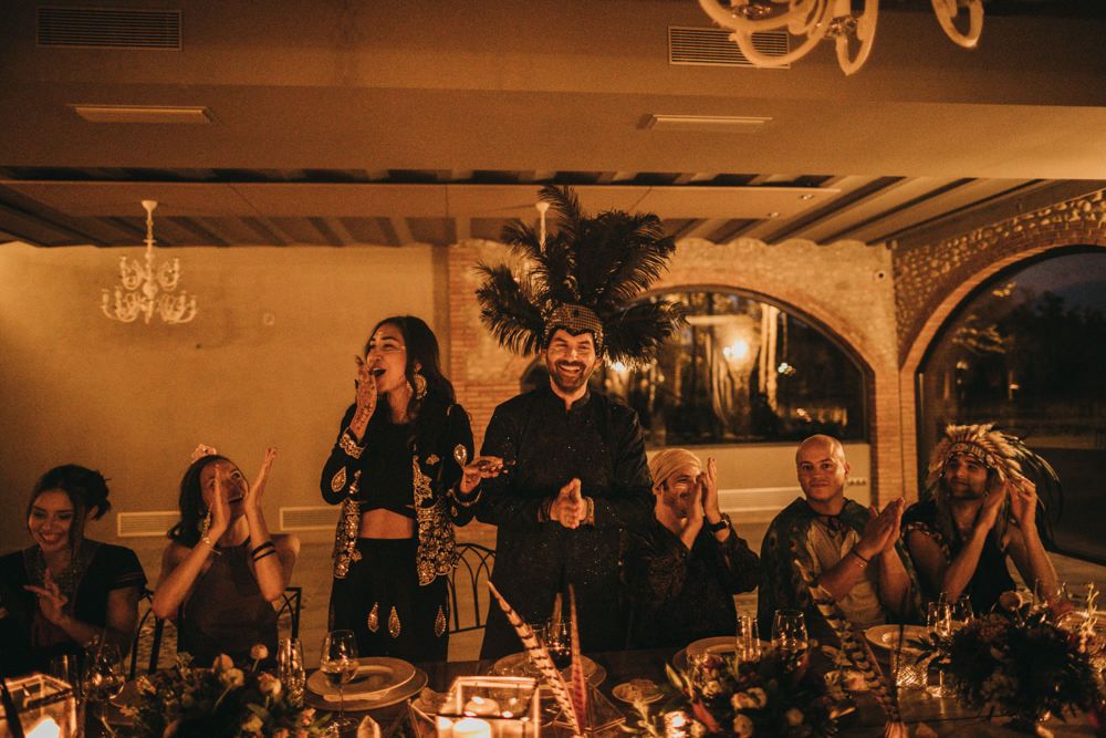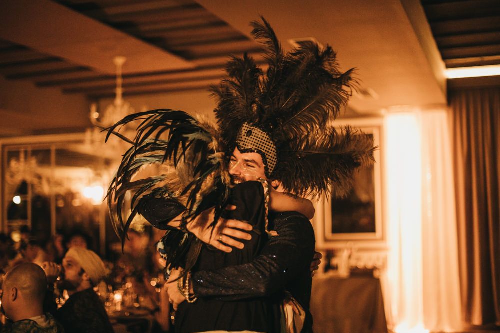 Our wedding was inspired by Burning Man Festival, with the details of the day having a marked boho character. The ceremony/ritual took place in the middle of a large mandala by the lake, our guests relaxed at low tables with carpets and cushions on the floor, a mural was made between the trees to paint with spray, and at the heart of the celebrations was a naked tipi in which to sing and play instruments. Burgundy colours, feathers and minerals dominated the décor. There was a short break between the day and evening festivities and, at night, guests became Indians and animals for dinner and dancing to our five DJs.