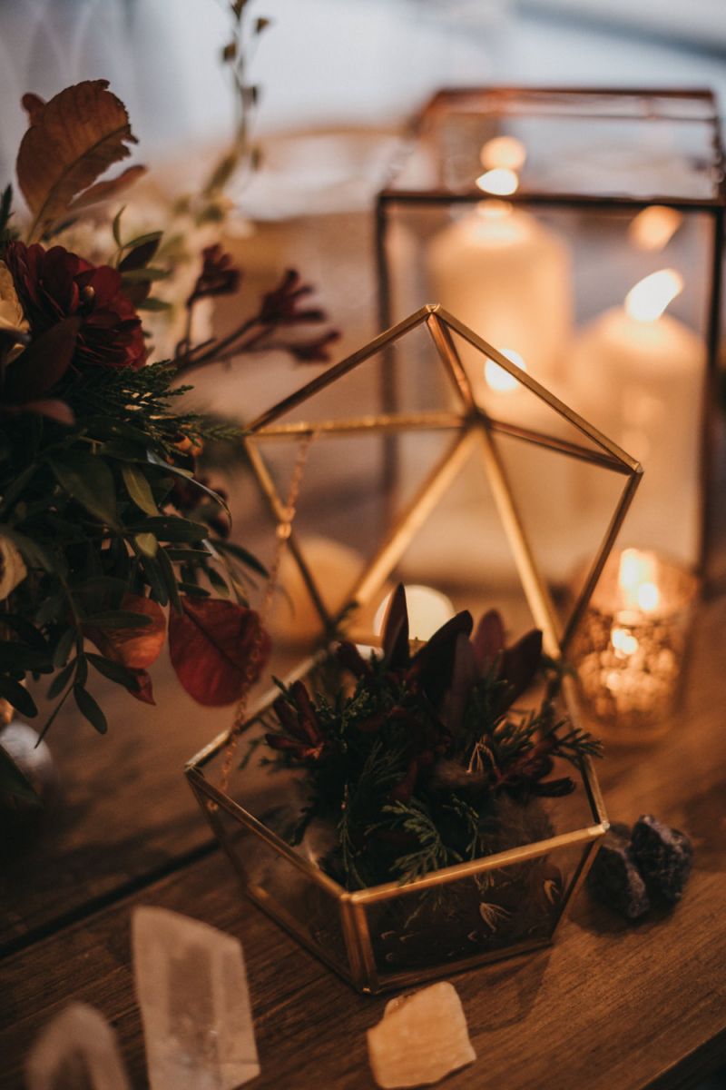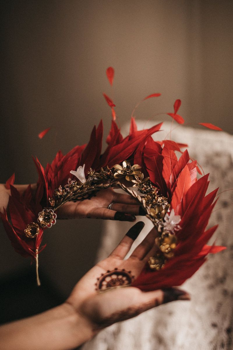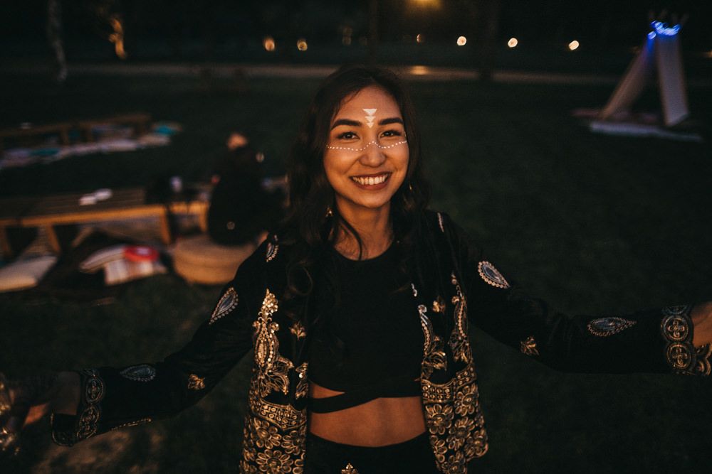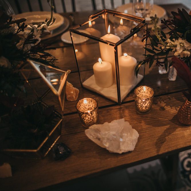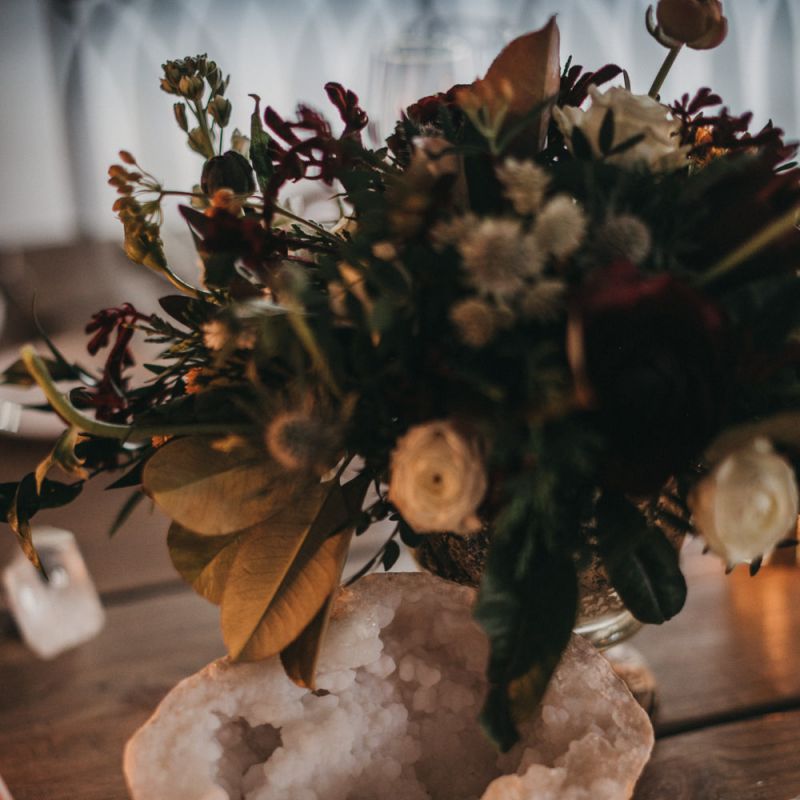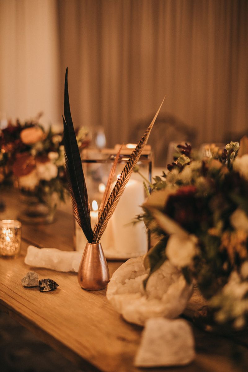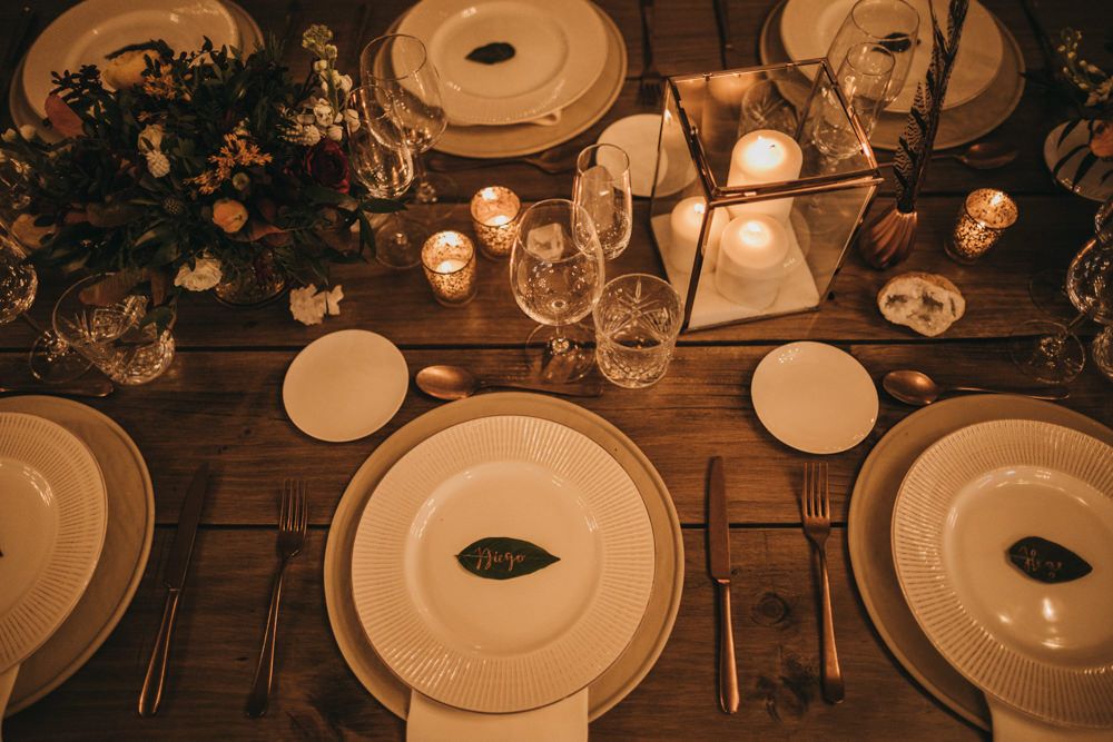 Our wedding was inspired by Burning Man Festival, with the details of the day having a marked boho character. The ceremony/ritual took place in the middle of a large mandala by the lake, our guests relaxed at low tables with carpets and cushions on the floor, a mural was made between the trees to paint with spray, and at the heart of the celebrations was a naked tipi in which to sing and play instruments. Burgundy colours, feathers and minerals dominated the décor. There was a short break between the day and evening festivities and, at night, guests became Indians and animals for dinner and dancing to our five DJs.