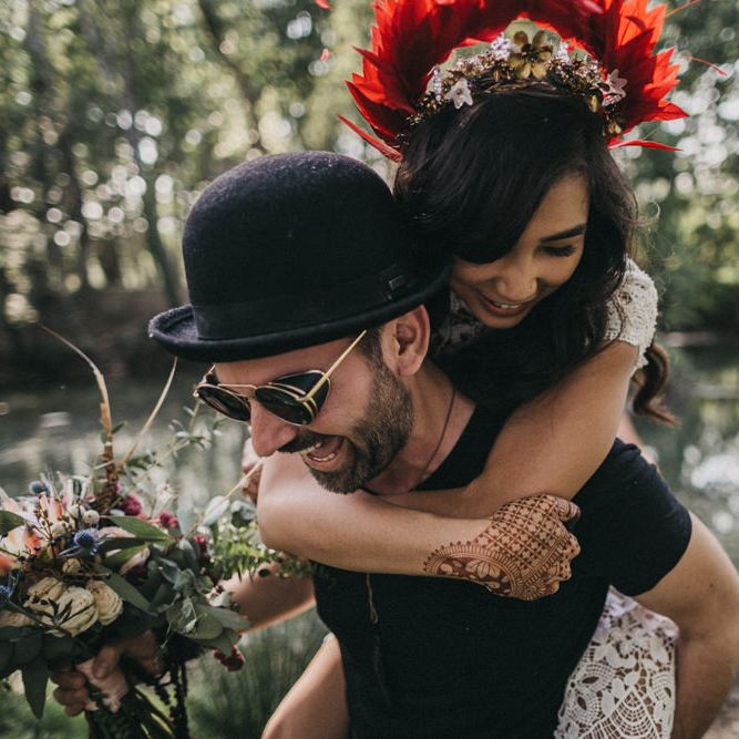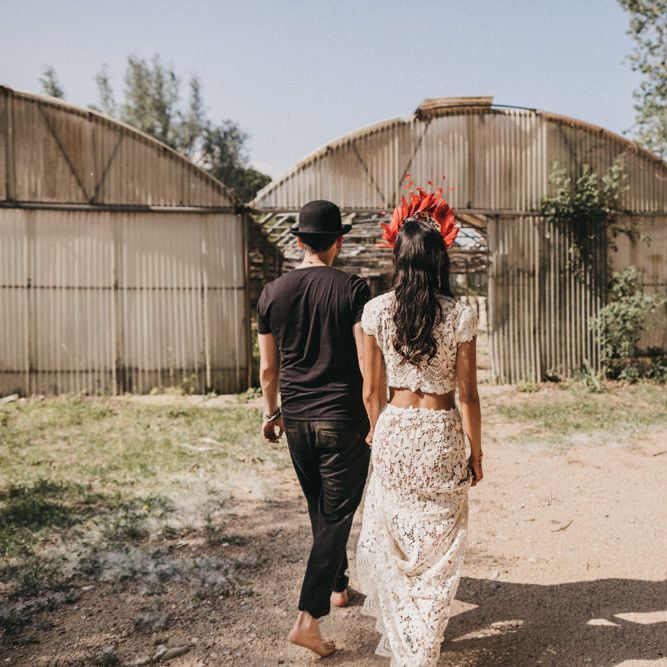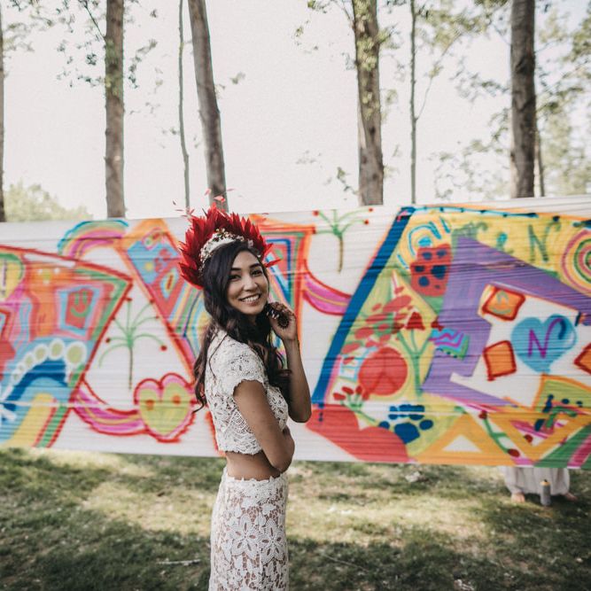 Festival Wedding with Naked Tipi Chill Out Area, Lace Bridal Separates, Feather Flower Crown and Protea Bouquet