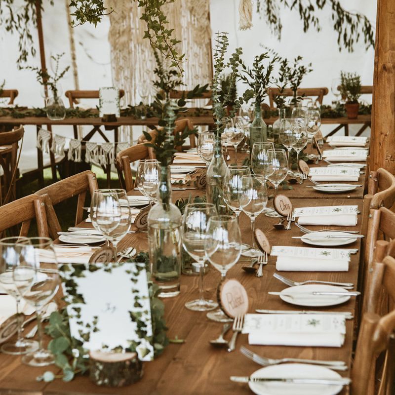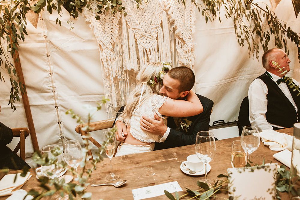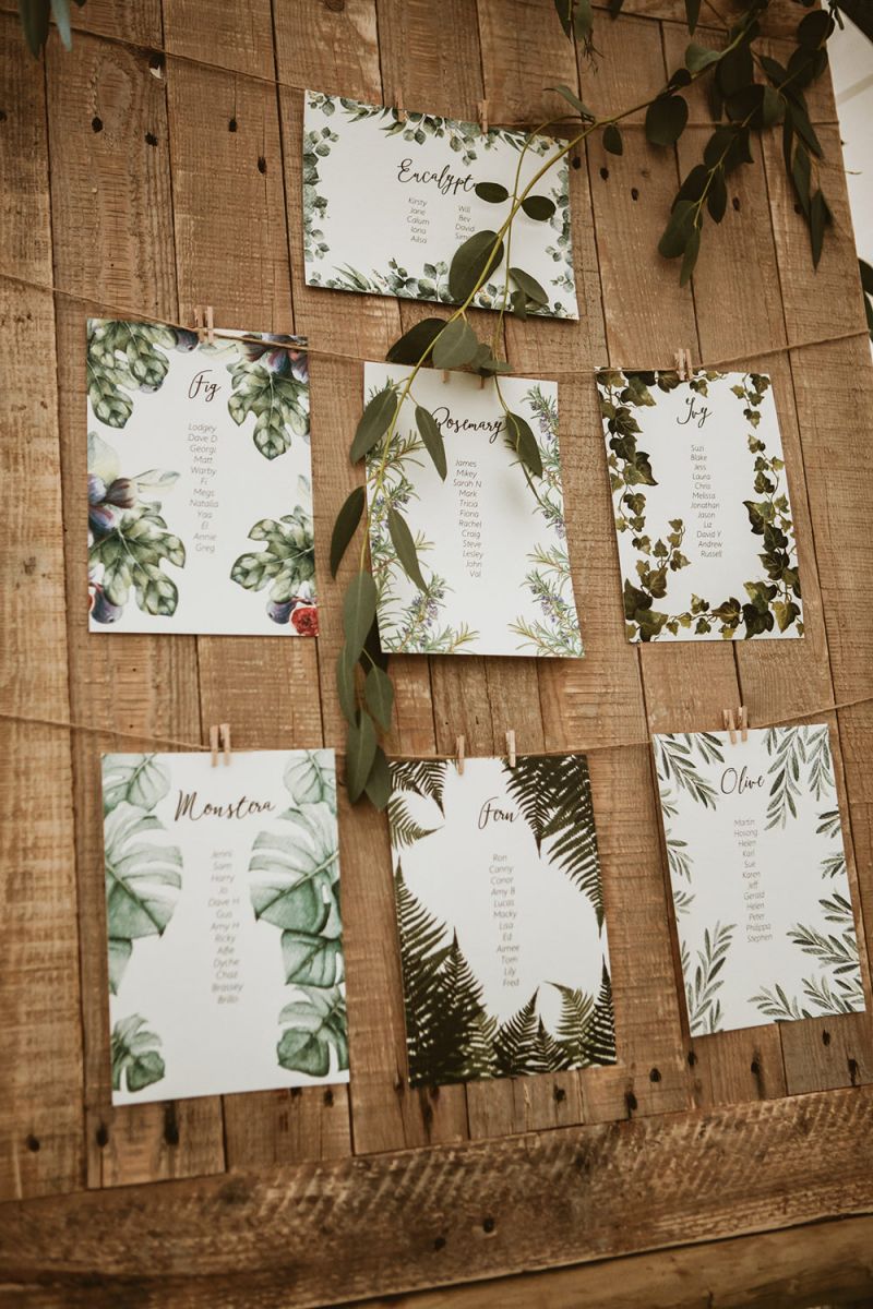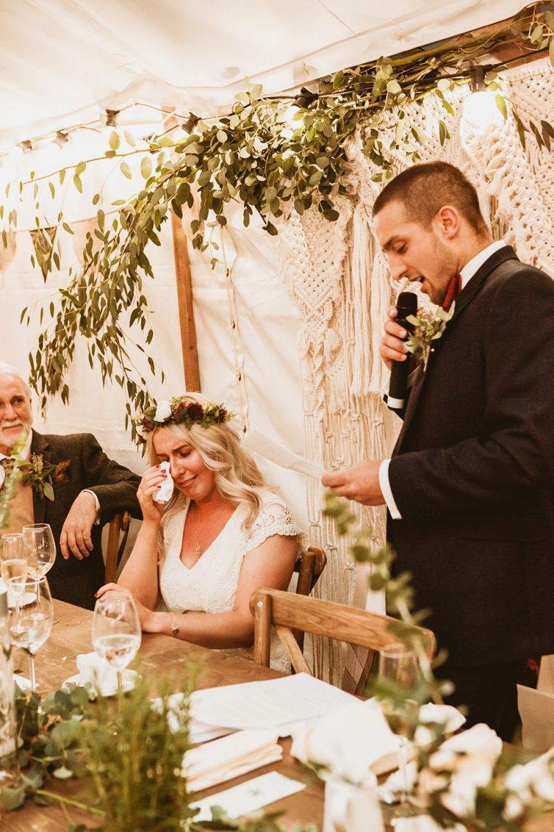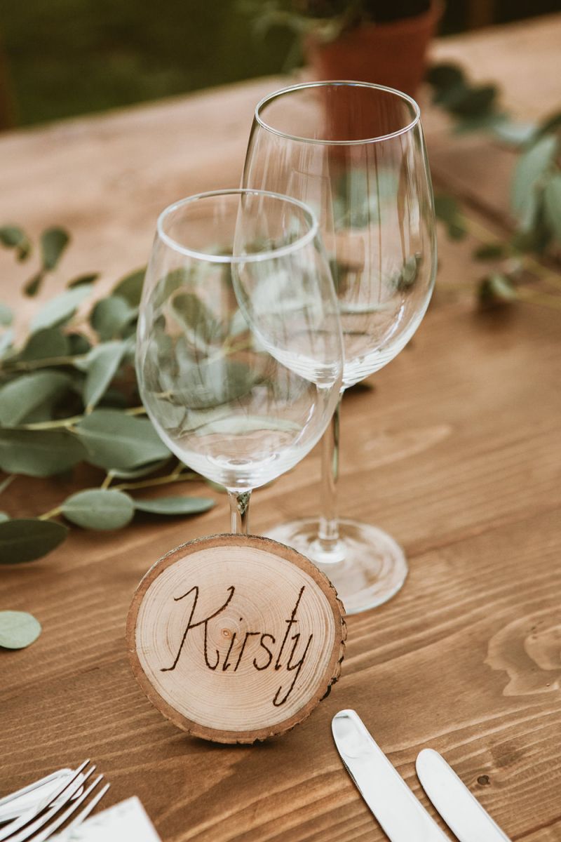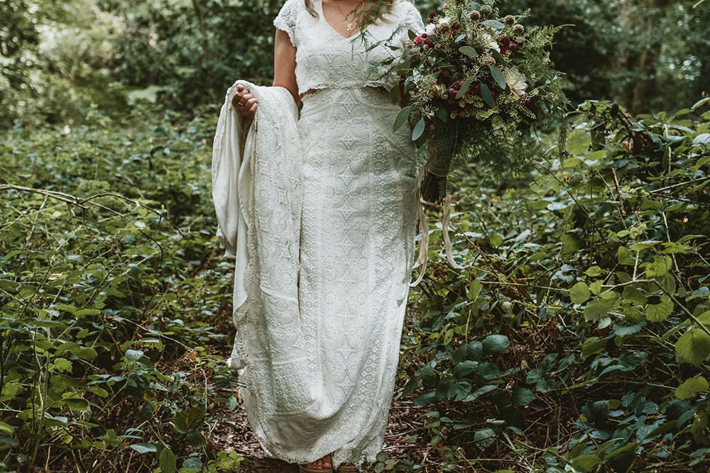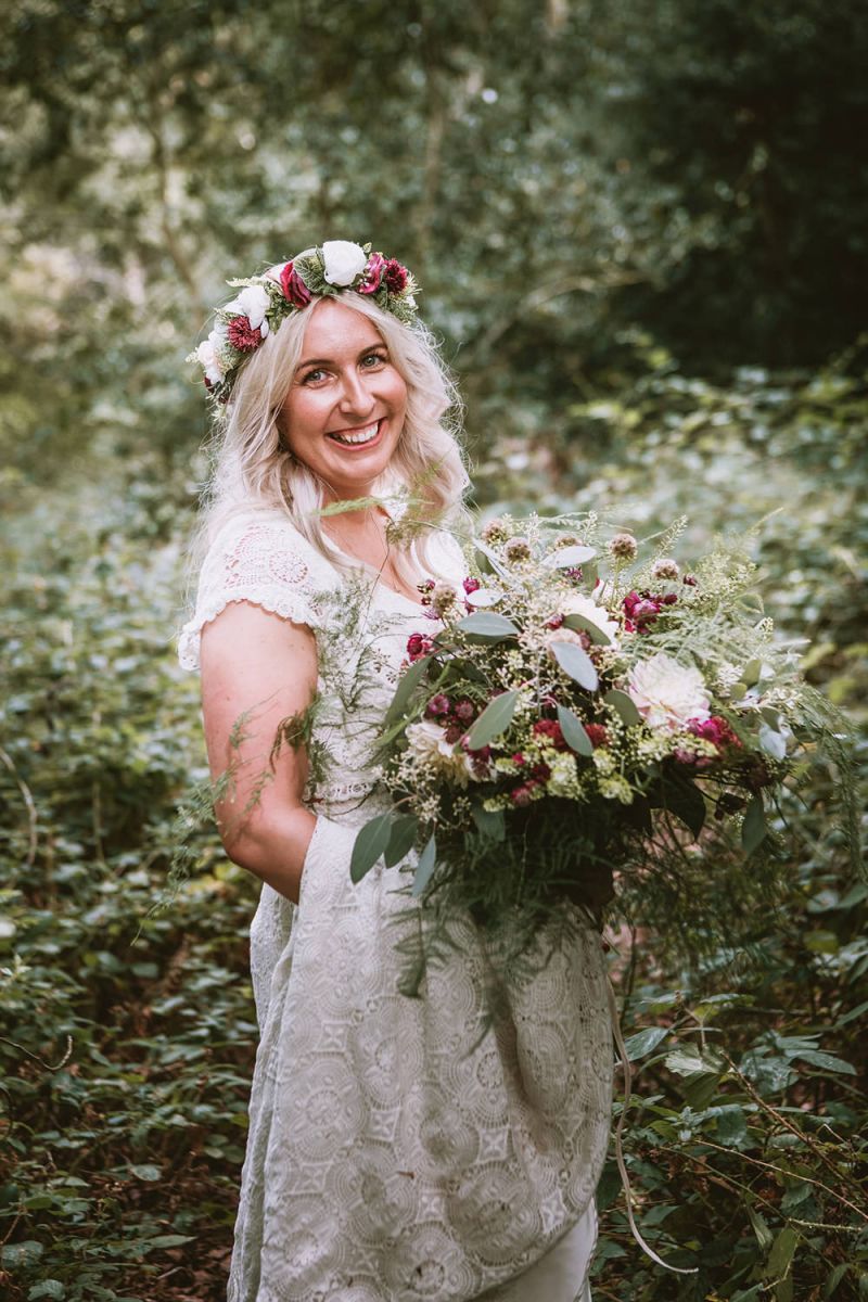 The day had a very rustic vibe. We tried to save money by doing things ourselves wherever we could; we did all our own stationery printing, collected empty gin bottles to hold greenery for the tables, dried rose petals for a year and made our own confetti cones, and even foraged woodland for greenery and logs to create our natural look. Our neighbour also cut down their eucalyptus tree before the wedding which was very useful! My Daughters of Simone boho wedding dress, complete with tassels, was perfect for the vibe of the day and our local florist, Brambles, created complementary bouquets that were wild, trailing and full of beautiful foliage.