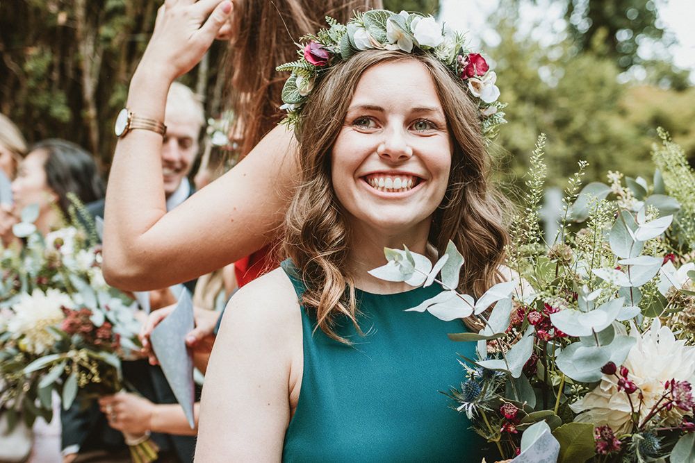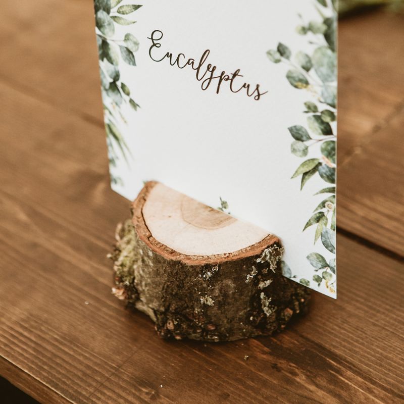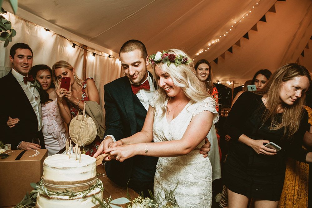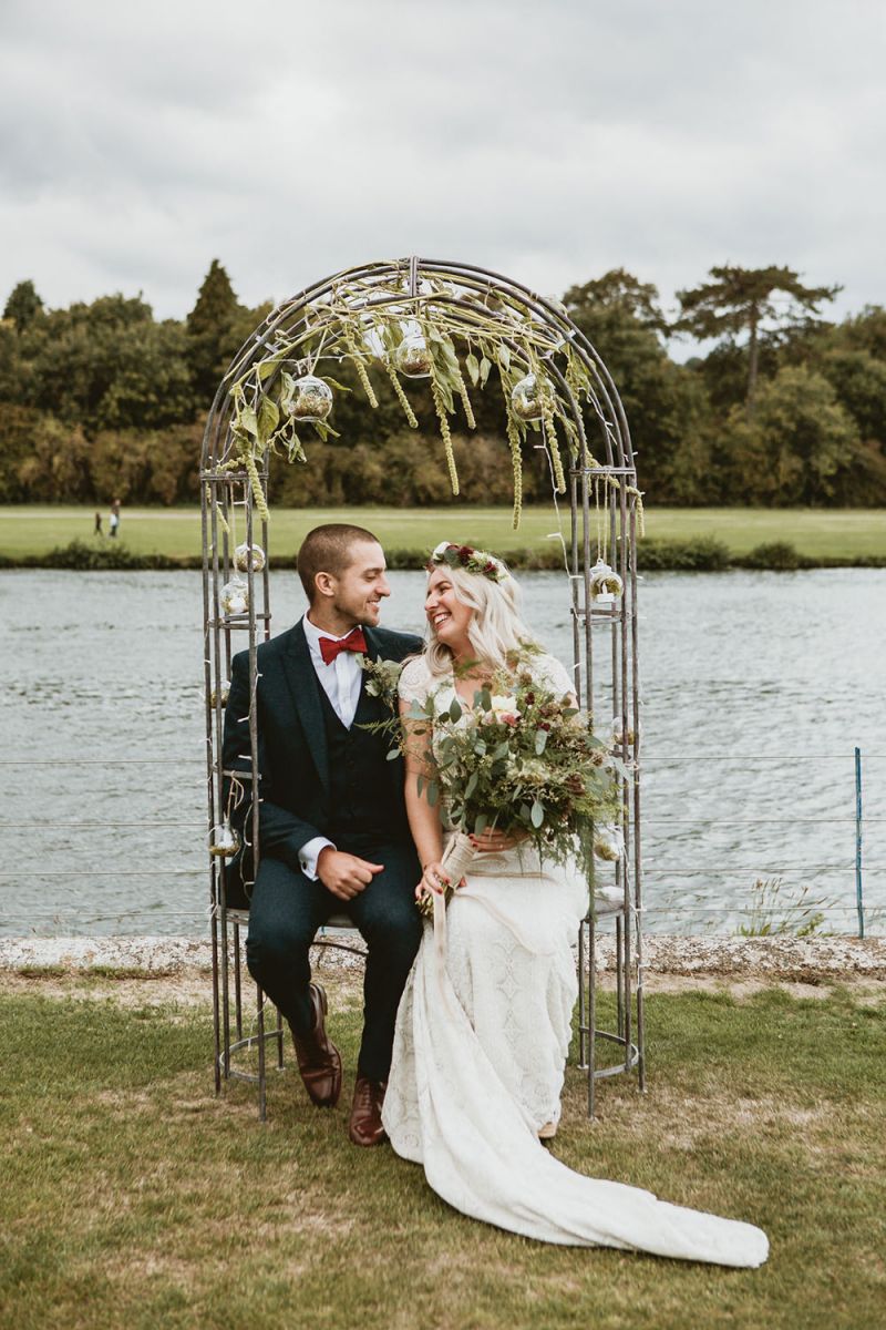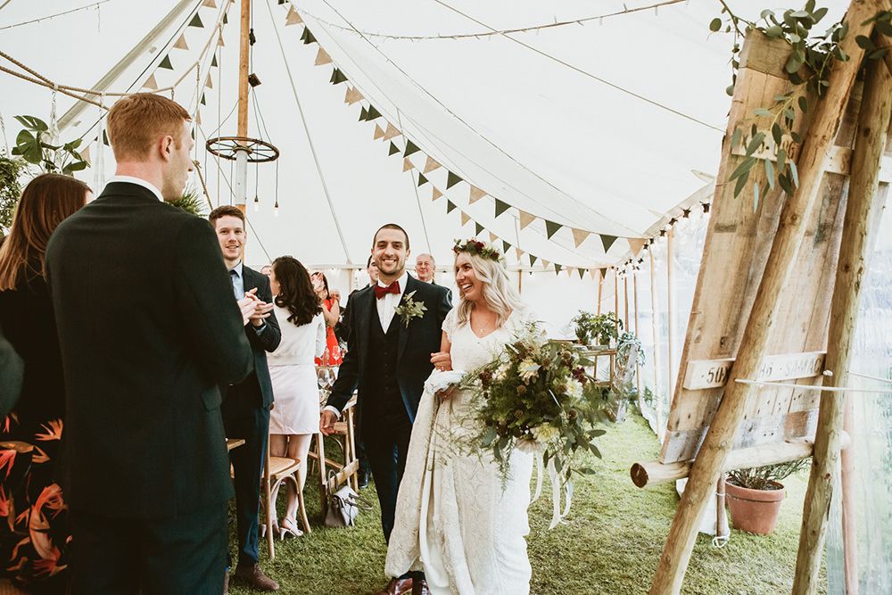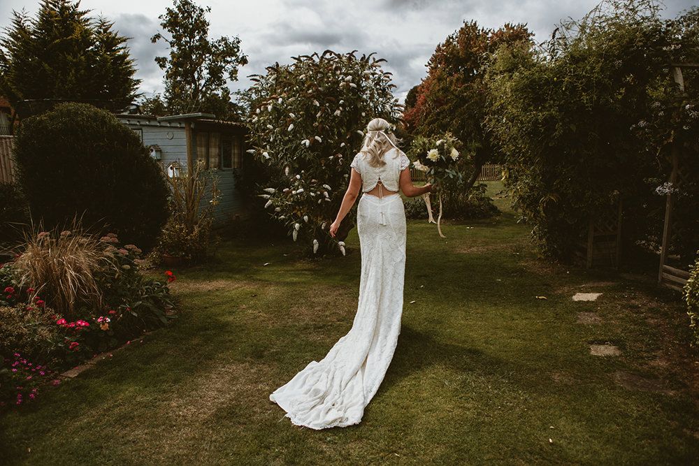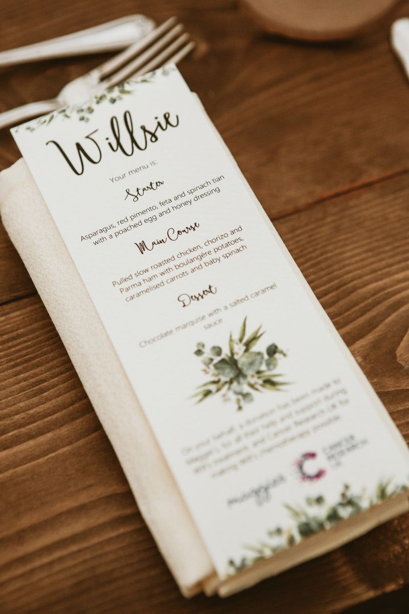 The day had a very rustic vibe. We tried to save money by doing things ourselves wherever we could; we did all our own stationery printing, collected empty gin bottles to hold greenery for the tables, dried rose petals for a year and made our own confetti cones, and even foraged woodland for greenery and logs to create our natural look. Our neighbour also cut down their eucalyptus tree before the wedding which was very useful! My Daughters of Simone boho wedding dress, complete with tassels, was perfect for the vibe of the day and our local florist, Brambles, created complementary bouquets that were wild, trailing and full of beautiful foliage.