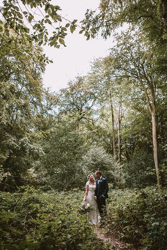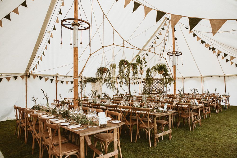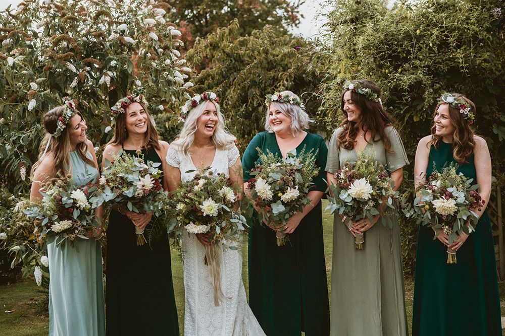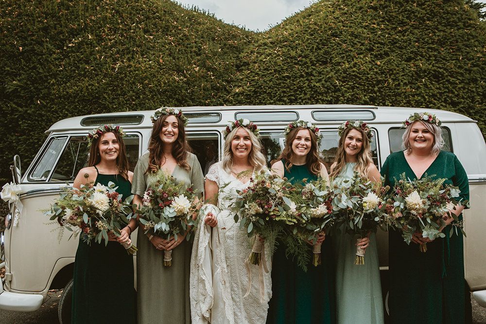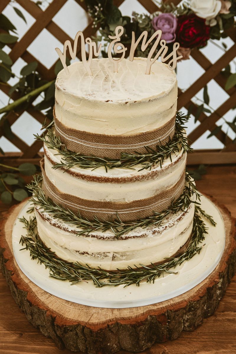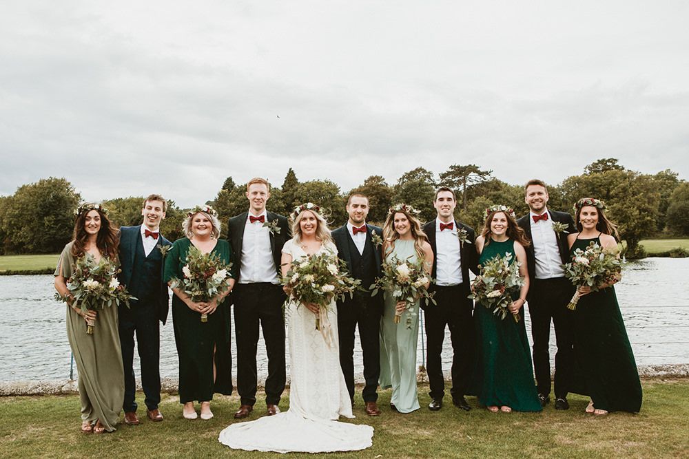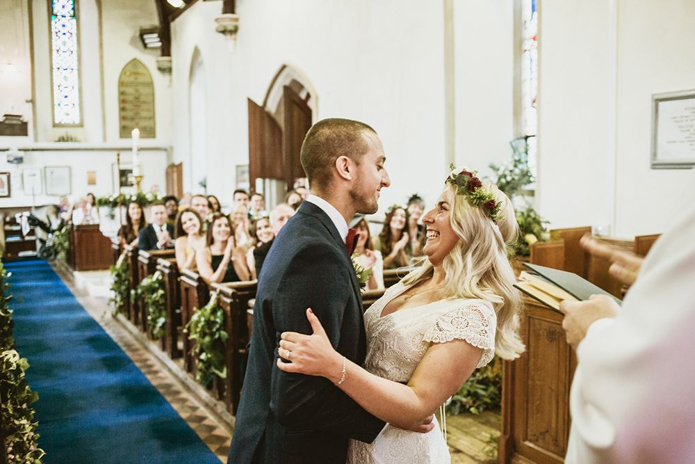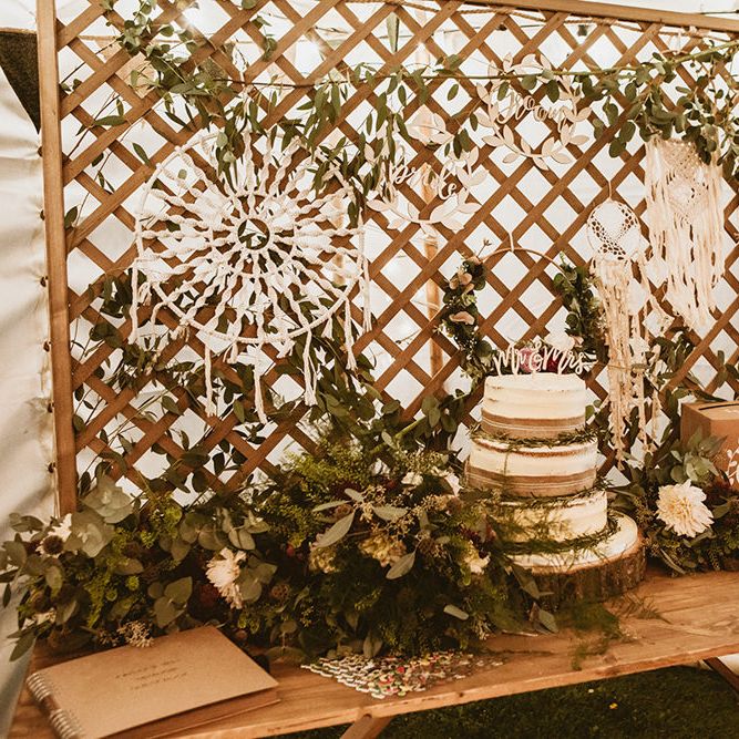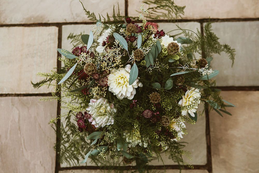 The day had a very rustic vibe. We tried to save money by doing things ourselves wherever we could; we did all our own stationery printing, collected empty gin bottles to hold greenery for the tables, dried rose petals for a year and made our own confetti cones, and even foraged woodland for greenery and logs to create our natural look. Our neighbour also cut down their eucalyptus tree before the wedding which was very useful! My Daughters of Simone boho wedding dress, complete with tassels, was perfect for the vibe of the day and our local florist, Brambles, created complementary bouquets that were wild, trailing and full of beautiful foliage.