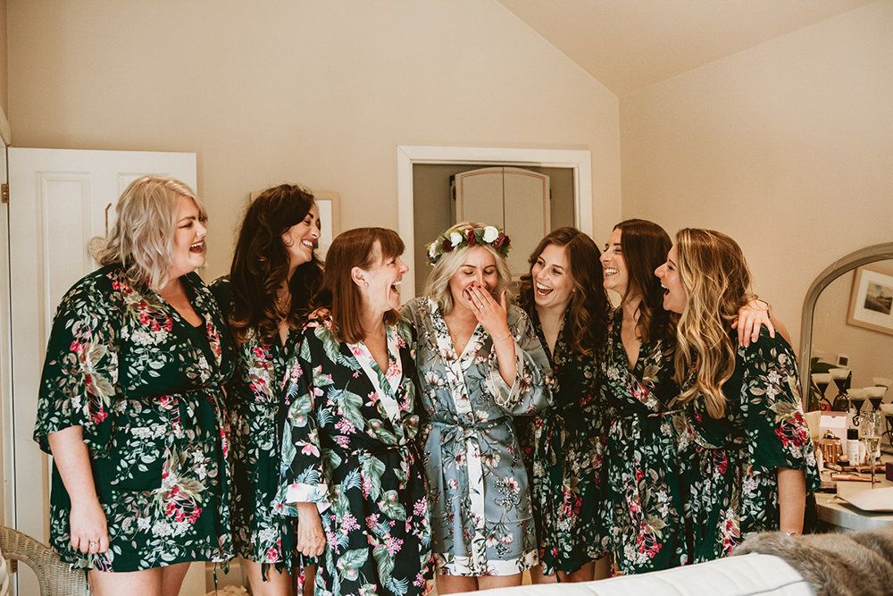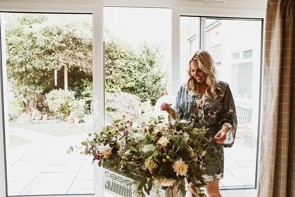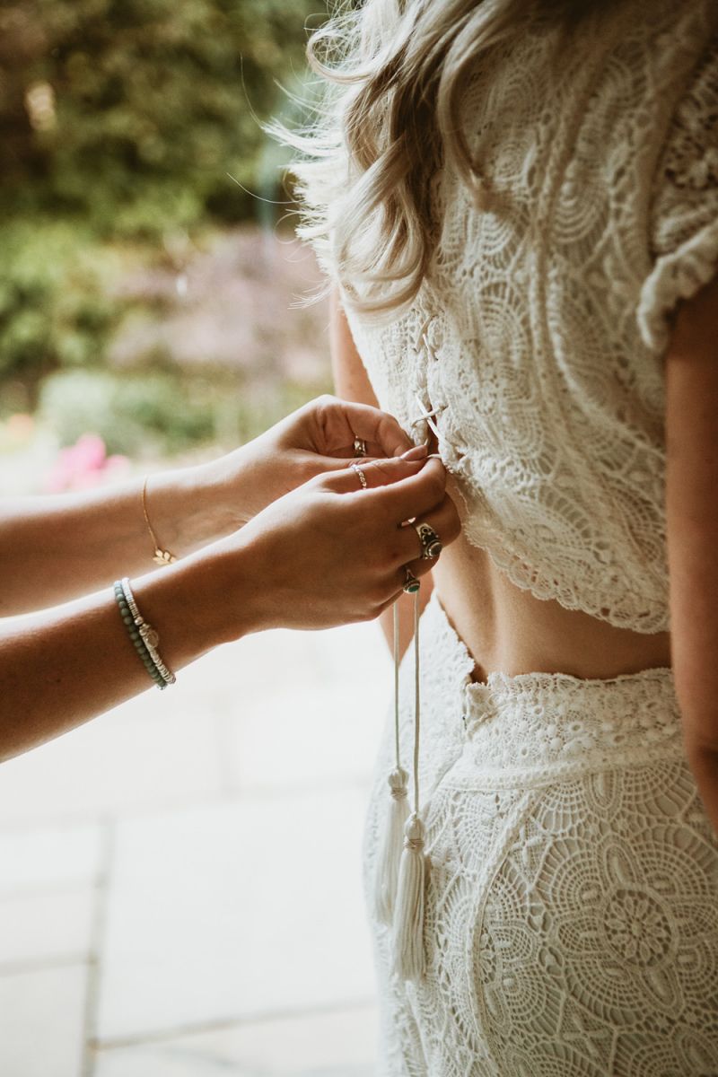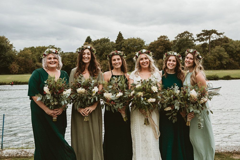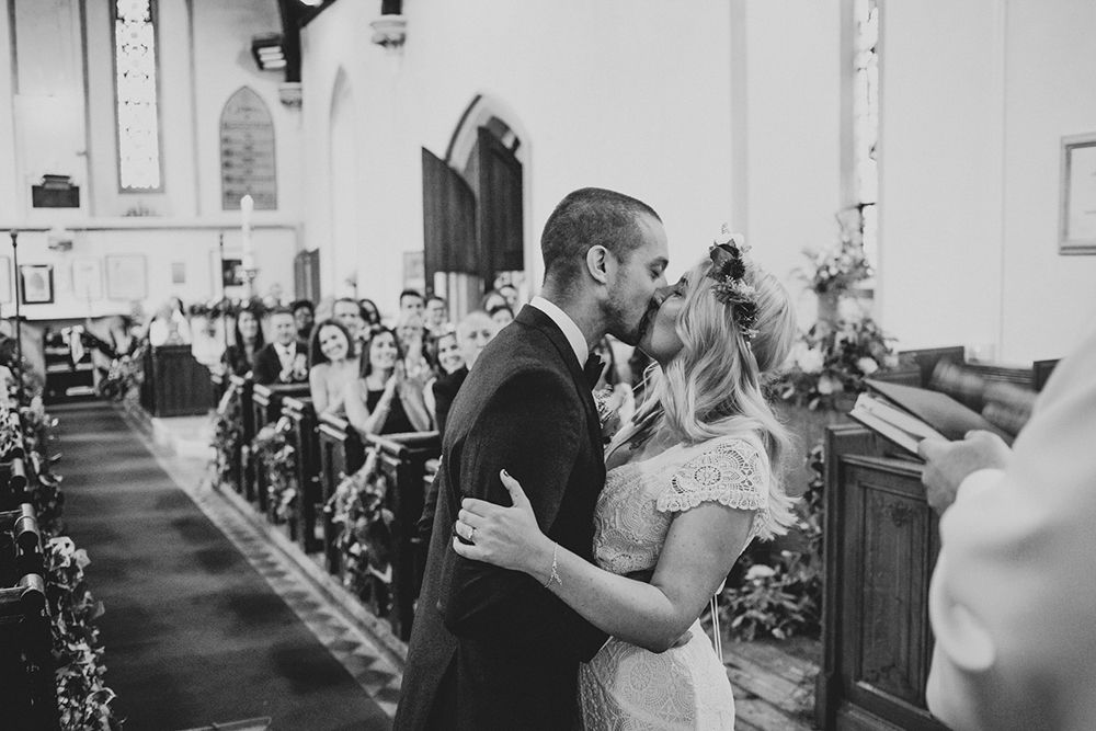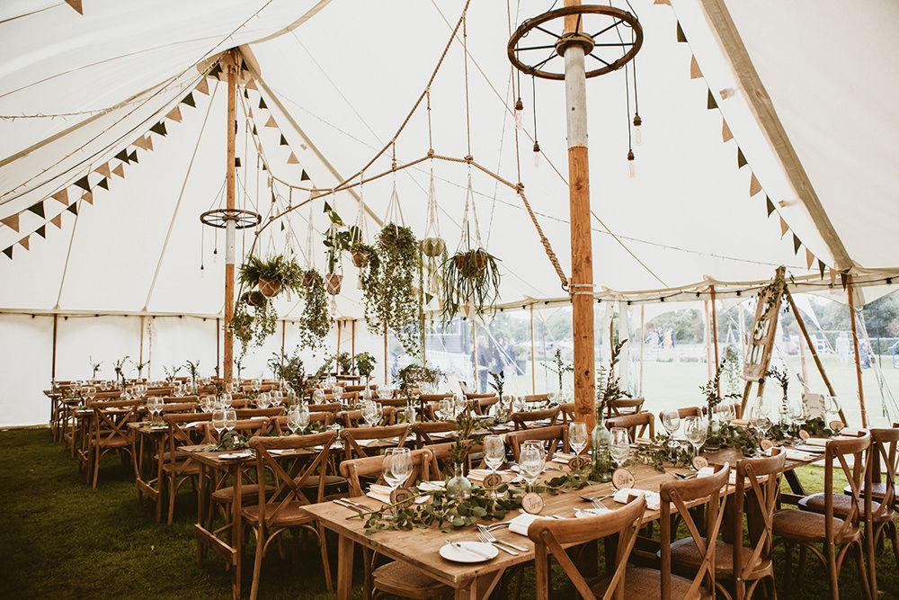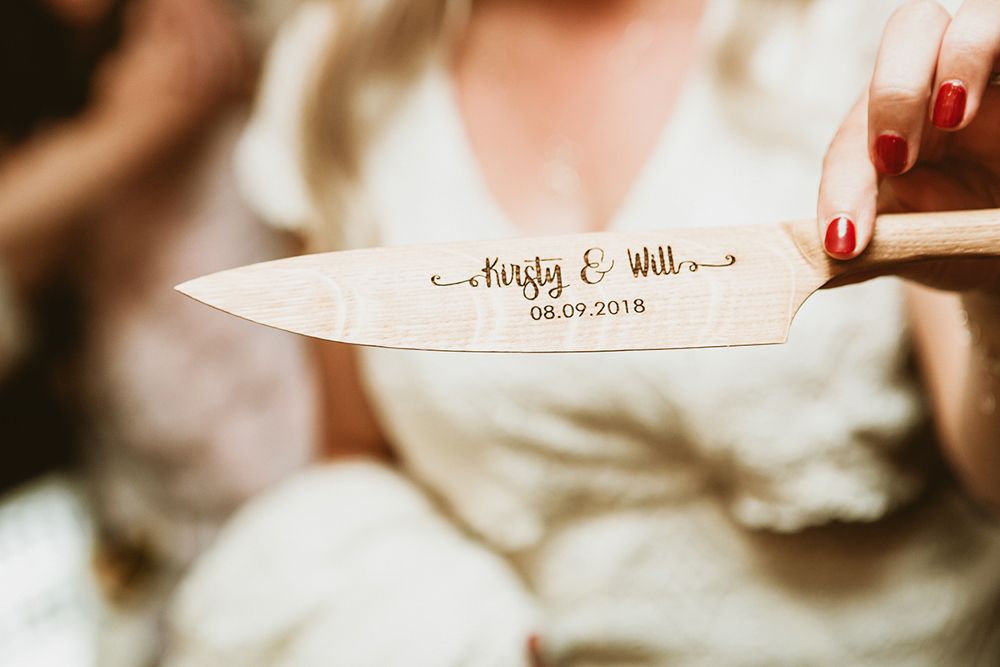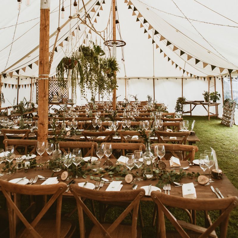 The day had a very rustic vibe. We tried to save money by doing things ourselves wherever we could; we did all our own stationery printing, collected empty gin bottles to hold greenery for the tables, dried rose petals for a year and made our own confetti cones, and even foraged woodland for greenery and logs to create our natural look. Our neighbour also cut down their eucalyptus tree before the wedding which was very useful! My Daughters of Simone boho wedding dress, complete with tassels, was perfect for the vibe of the day and our local florist, Brambles, created complementary bouquets that were wild, trailing and full of beautiful foliage.