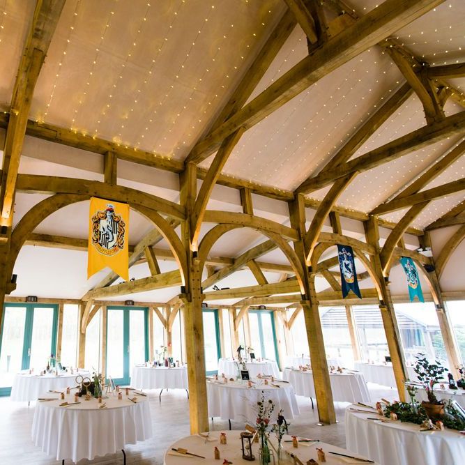 Due to the date being in November, we went for an autumnal wildflower theme with the flowers and candles in the barn during the ceremony. However, the bar and dining area were kitted out with Harry Potter in mind, including Hogwarts house banners, bunting, artwork and many objects relating to different classrooms. With the invitation came a dress code, with guests asked to dress in the colours of the house they were sorted into, and we felt this made for a more relaxed than a completely formal affair, which we loved.