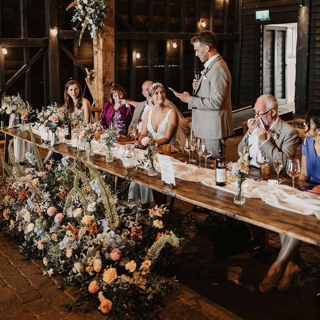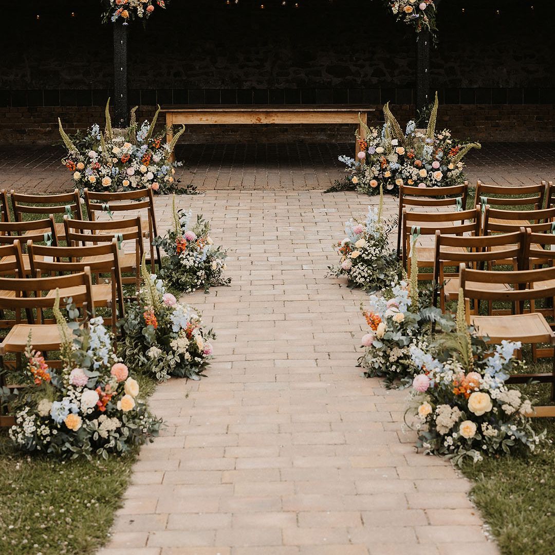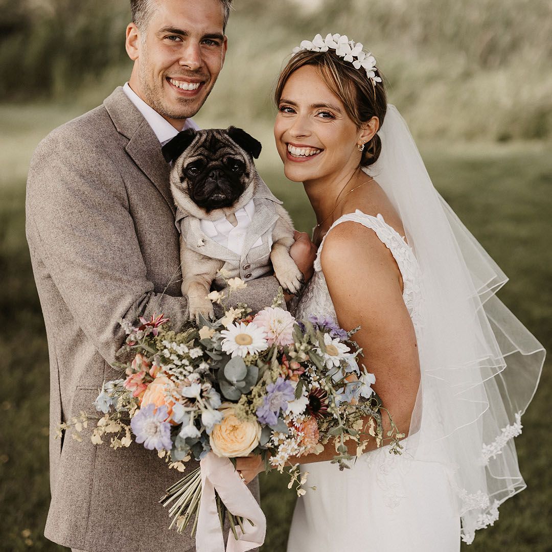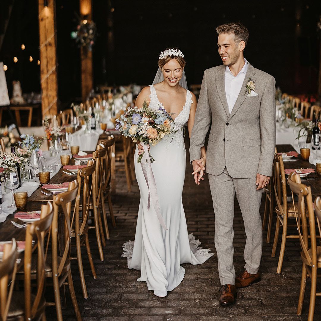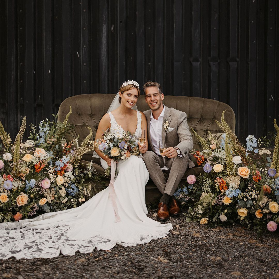 Lauren & Sam wanted their wedding to have a vibe that was a reflection of them, their interests and personalities. Their shared love of nature was a driving- force behind choosing the venue, with florals as the focal point of styling. The pastel blooms meant the rest of the decor was earthy with greens, amber and pinks. Sustainability-focused, Lauren & Sam ensured the blooms were reusable, moving them from ceremony to barn, bud vases for guests and pressing them post-wedding. Aisle flowers made perfect floor meadows at the end of each guest table and the ceremony meadows lined the front of the top table. Recommended Supplier, Moody Blooms, gave Lauren & Sam advice on how to press flowers from their arrangements to enjoy for years to come. Here’s what this fabulous florist has to say about wedding flowers.