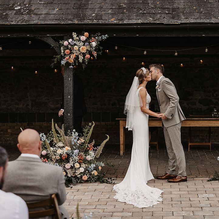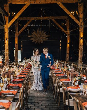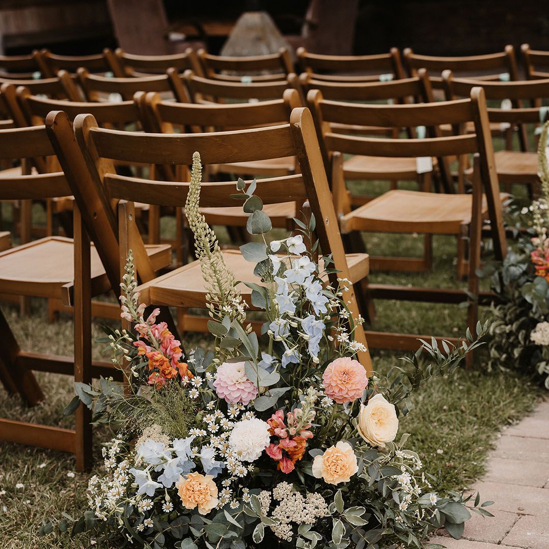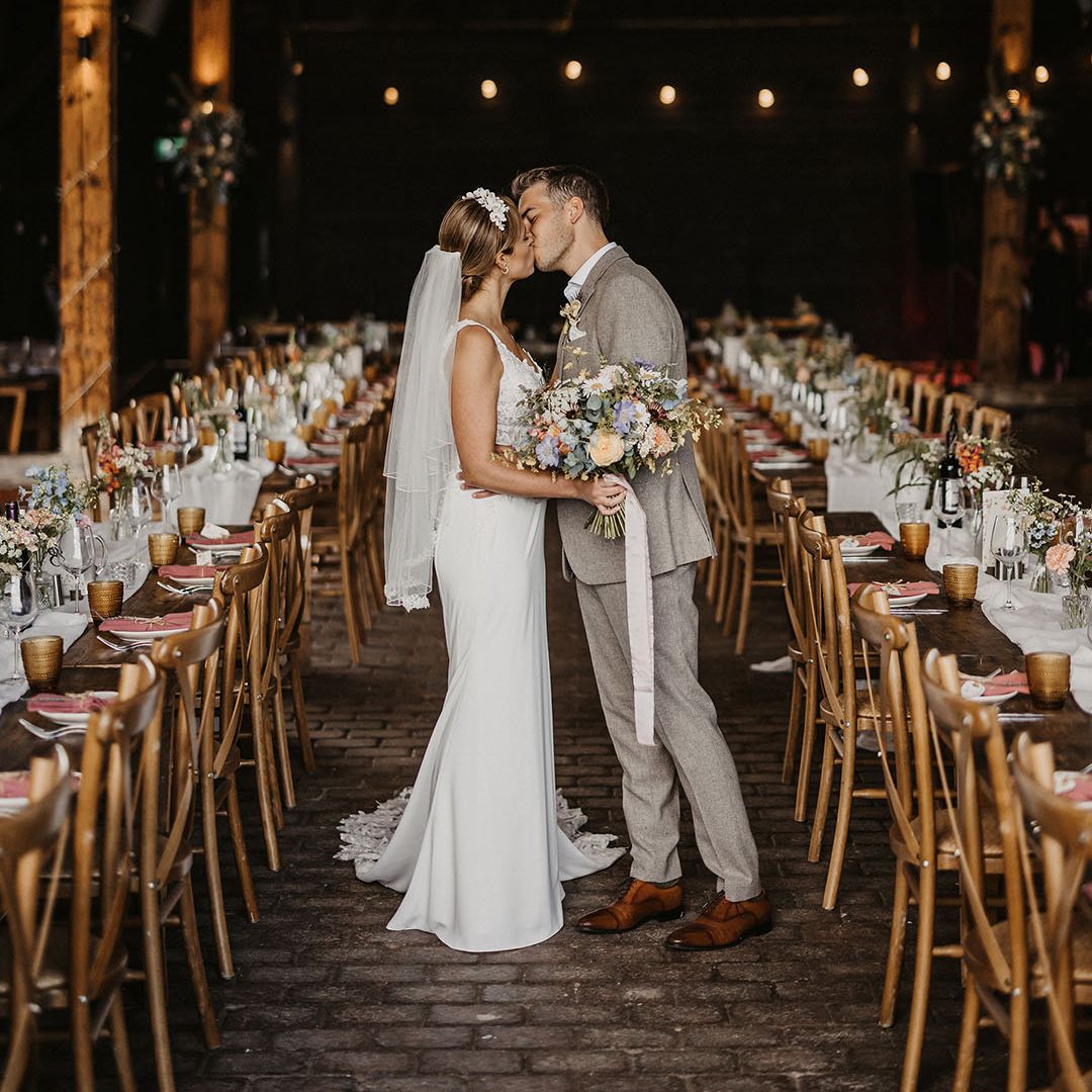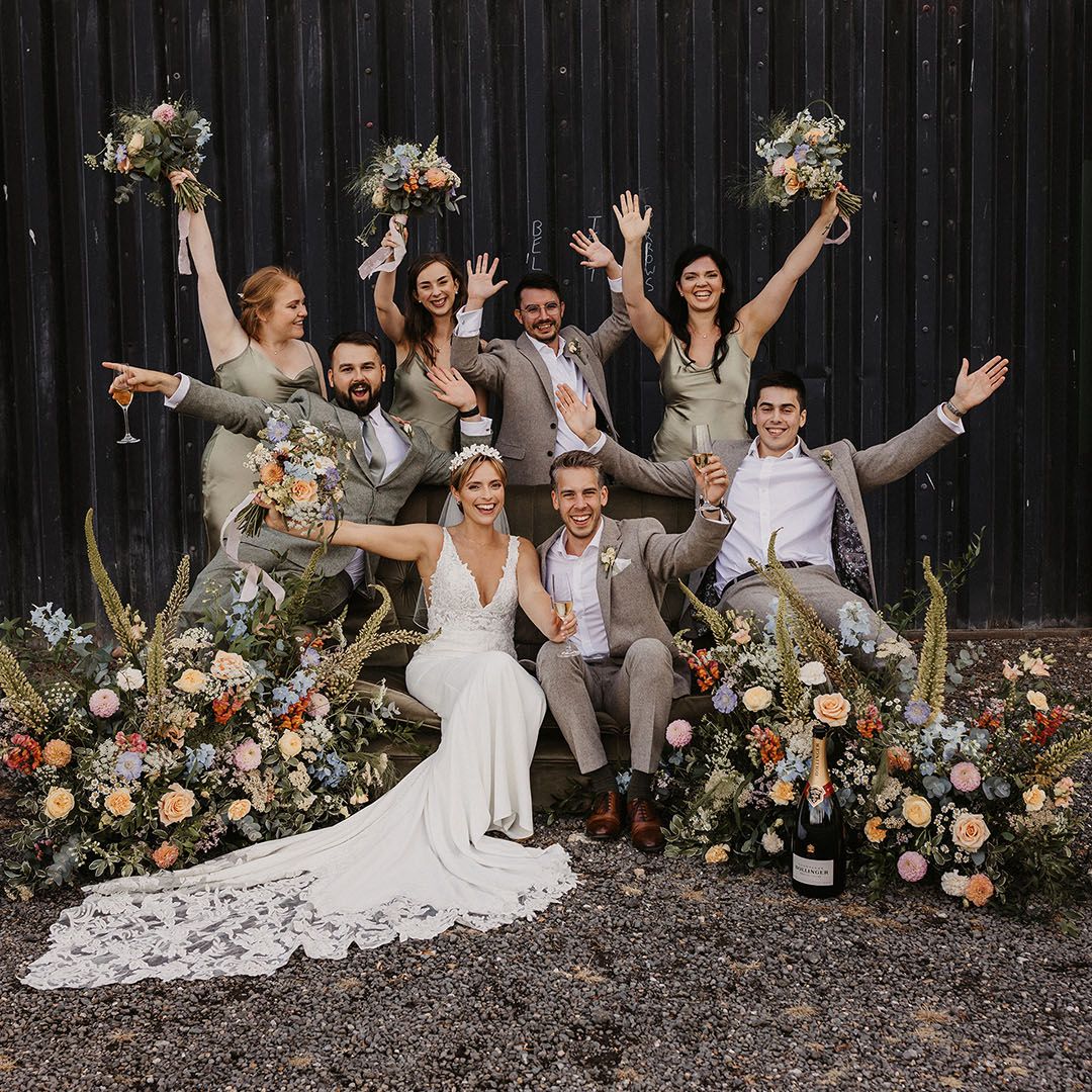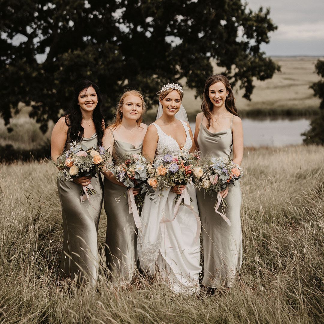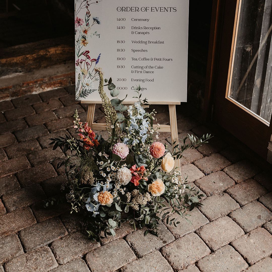 Lauren & Sam wanted their wedding to have a vibe that was a reflection of them, their interests and personalities. Their shared love of nature was a driving- force behind choosing the venue, with florals as the focal point of styling. The pastel blooms meant the rest of the decor was earthy with greens, amber and pinks. Sustainability-focused, Lauren & Sam ensured the blooms were reusable, moving them from ceremony to barn, bud vases for guests and pressing them post-wedding. Aisle flowers made perfect floor meadows at the end of each guest table and the ceremony meadows lined the front of the top table. Recommended Supplier, Moody Blooms, gave Lauren & Sam advice on how to press flowers from their arrangements to enjoy for years to come. Here’s what this fabulous florist has to say about wedding flowers.