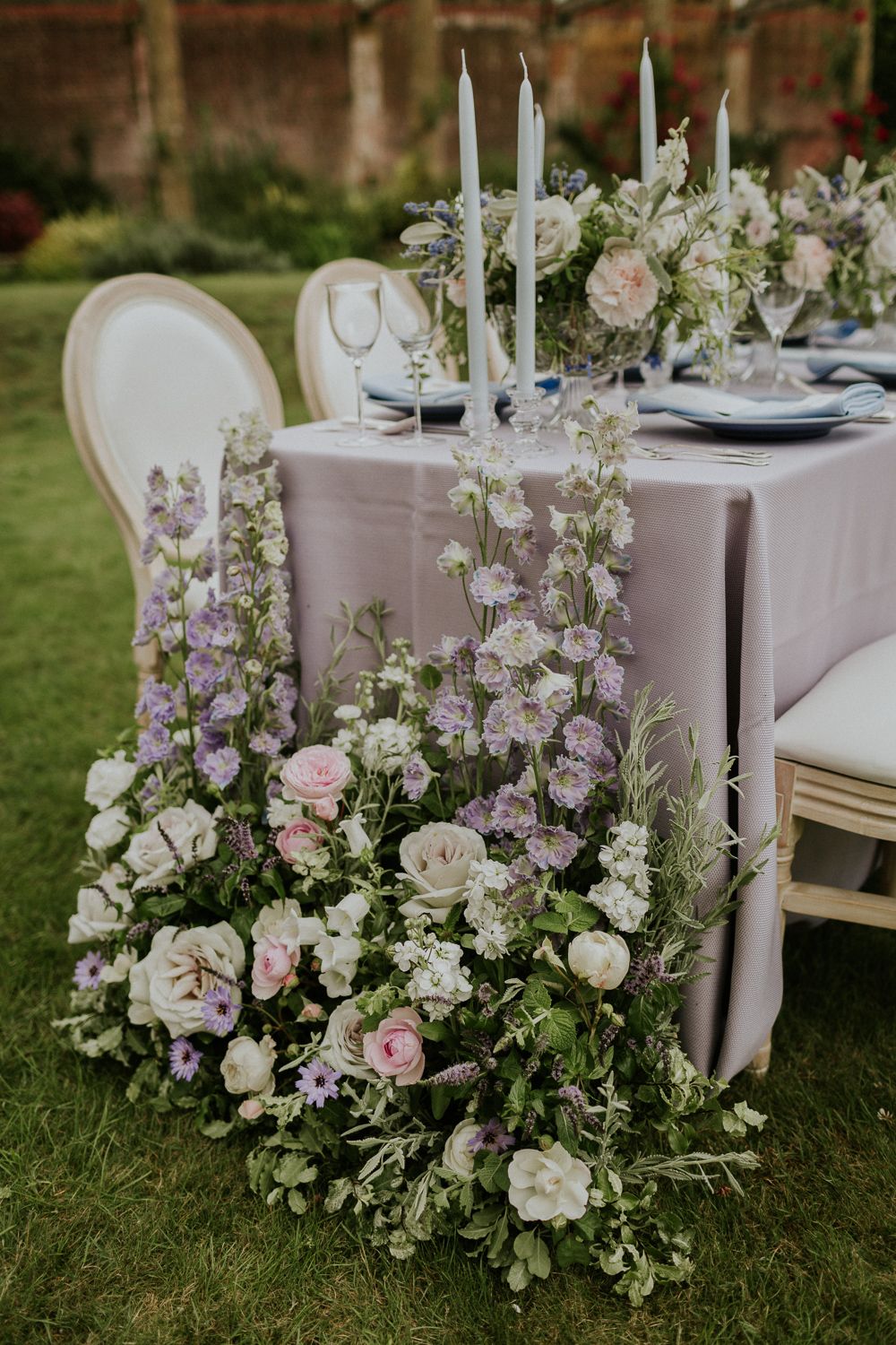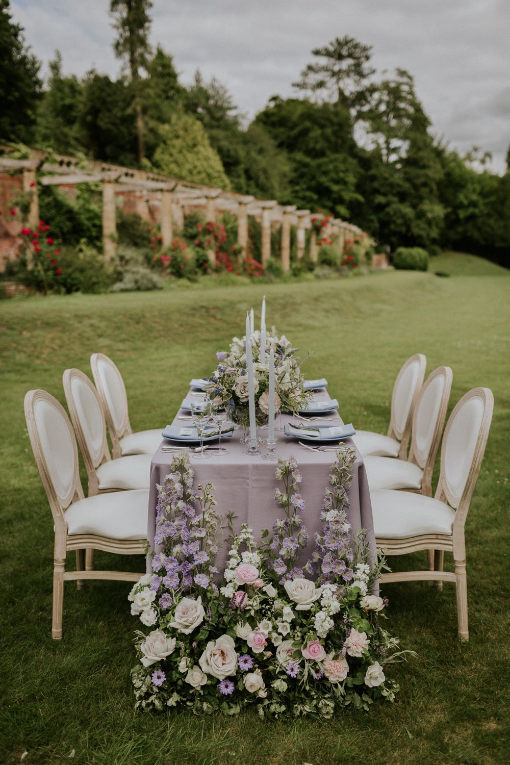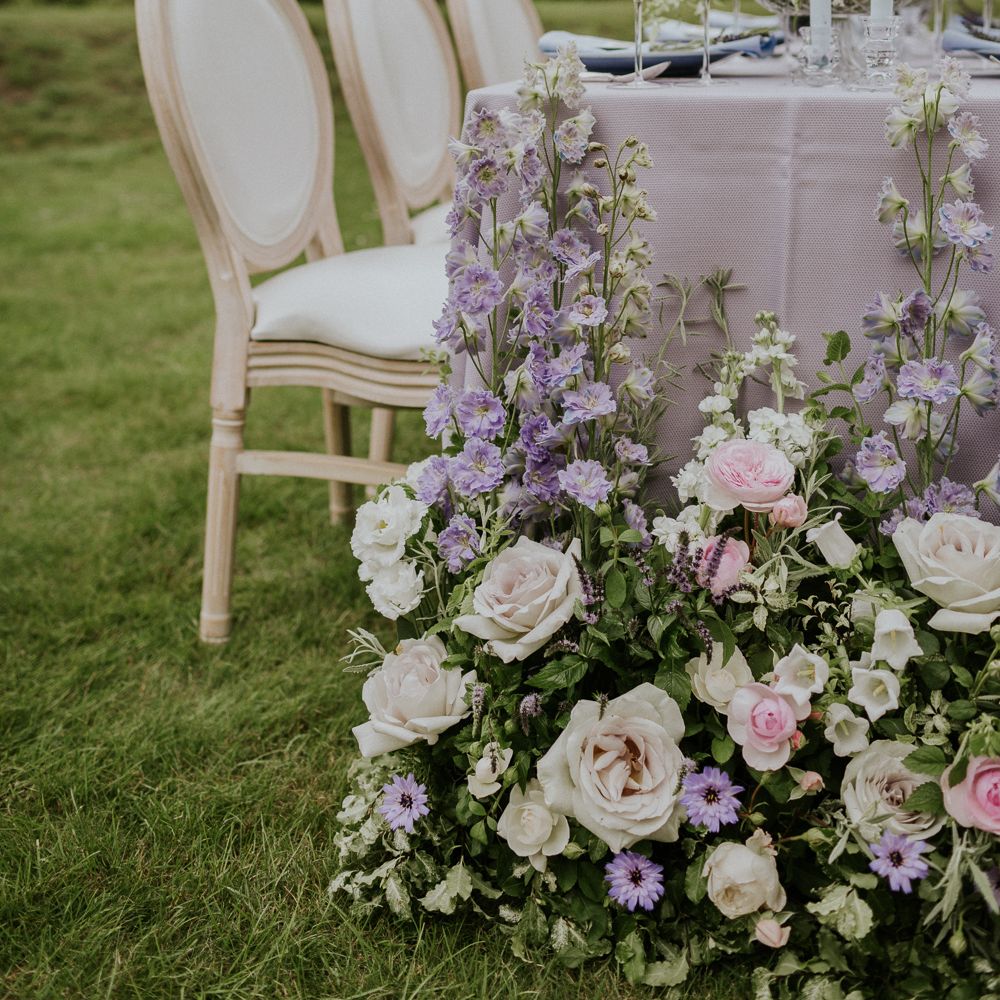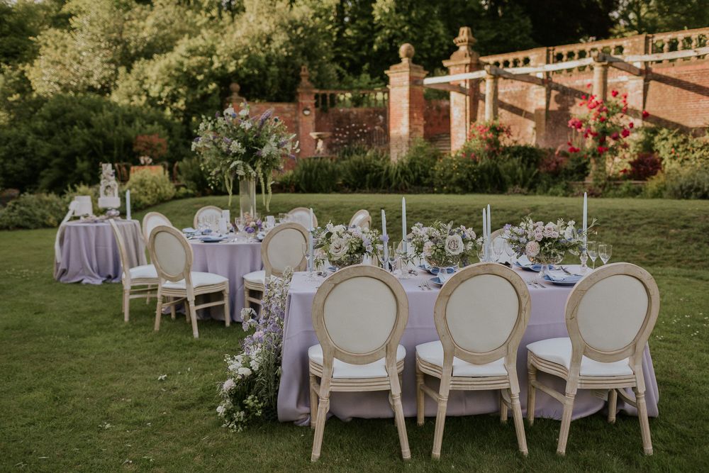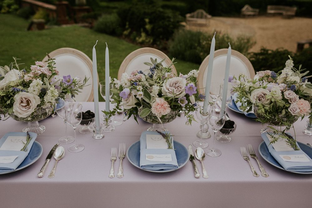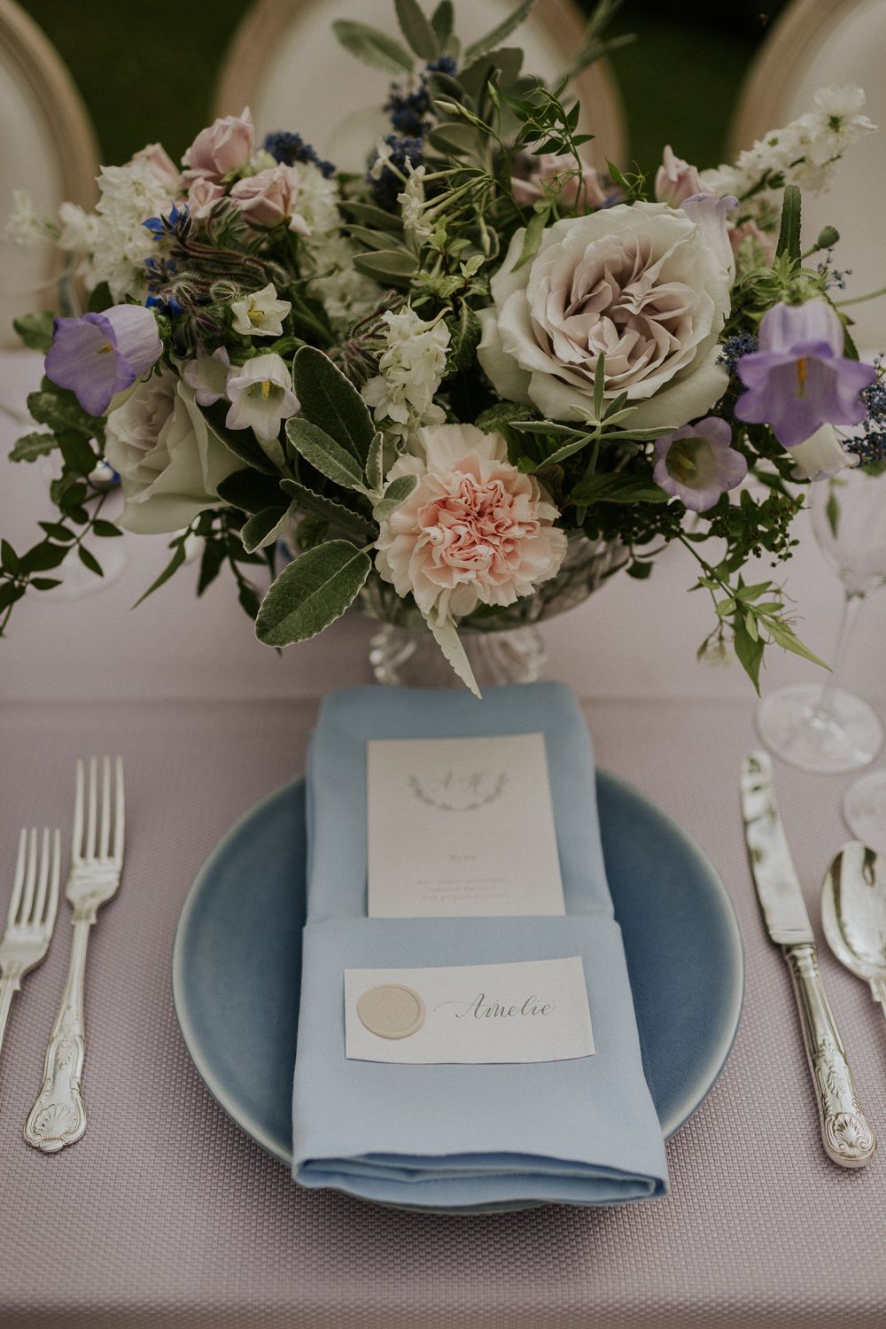 We wanted to experiment with the pale blues and lilacs that make a Provençal wedding so effortlessly pretty while incorporating our own modern touches such as the stoneware china and floral meadow. Provençal styling is typically more rustic than our design and makes more use of wooden furniture, though to add an element of luxury to the overall look, I opted for plush Louis chairs and heavy table linen in pale lilac.