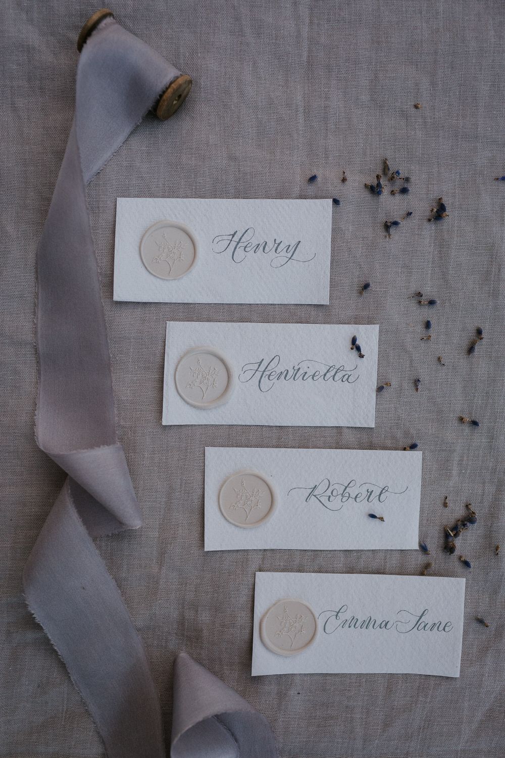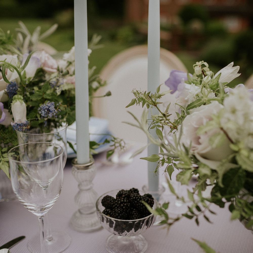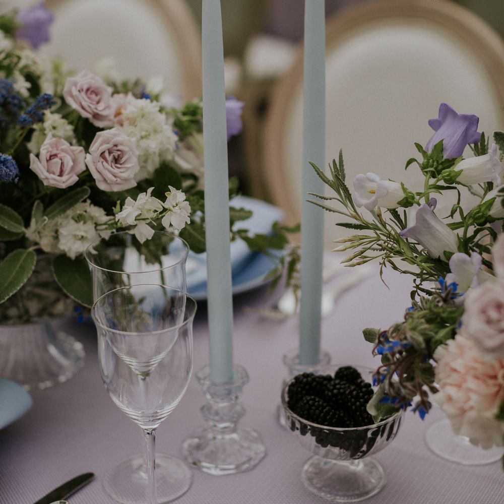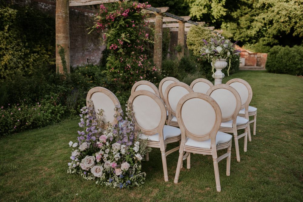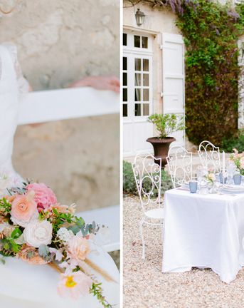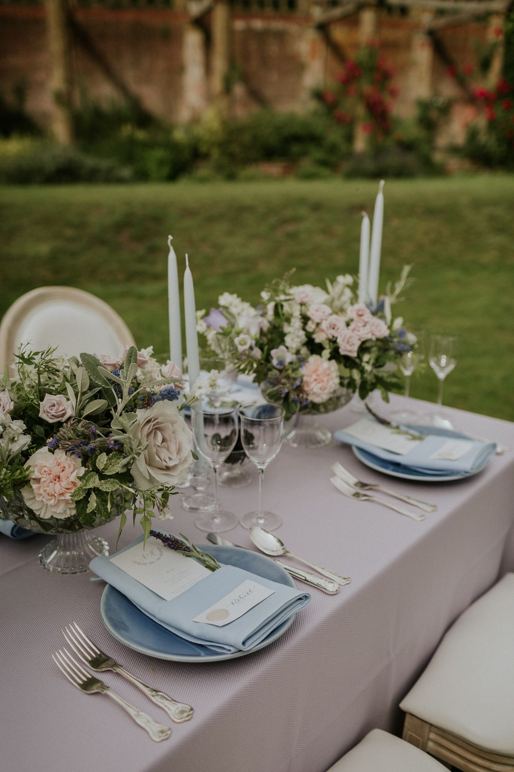 We wanted to experiment with the pale blues and lilacs that make a Provençal wedding so effortlessly pretty while incorporating our own modern touches such as the stoneware china and floral meadow. Provençal styling is typically more rustic than our design and makes more use of wooden furniture, though to add an element of luxury to the overall look, I opted for plush Louis chairs and heavy table linen in pale lilac.