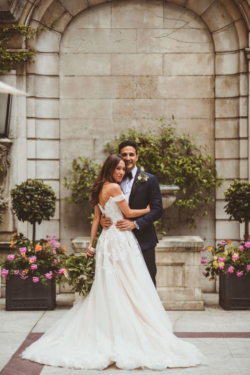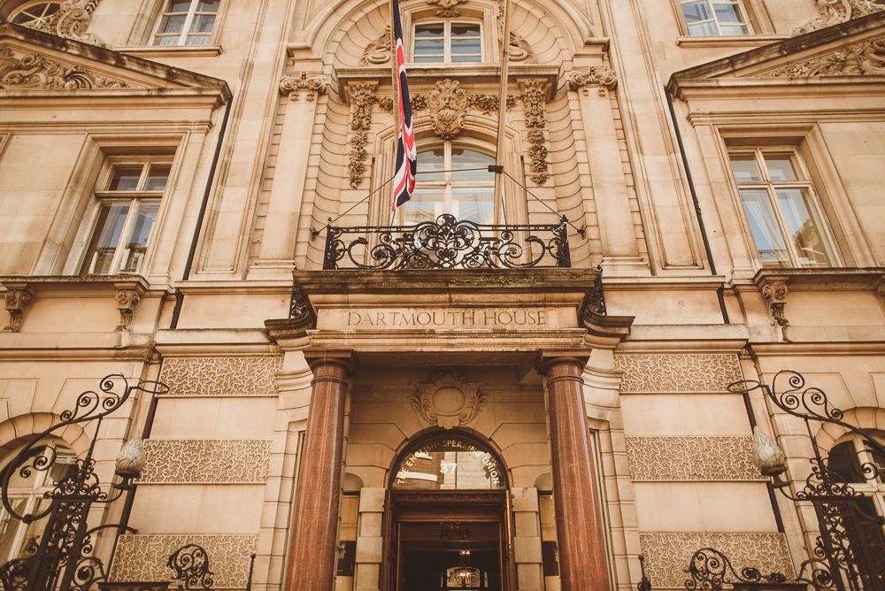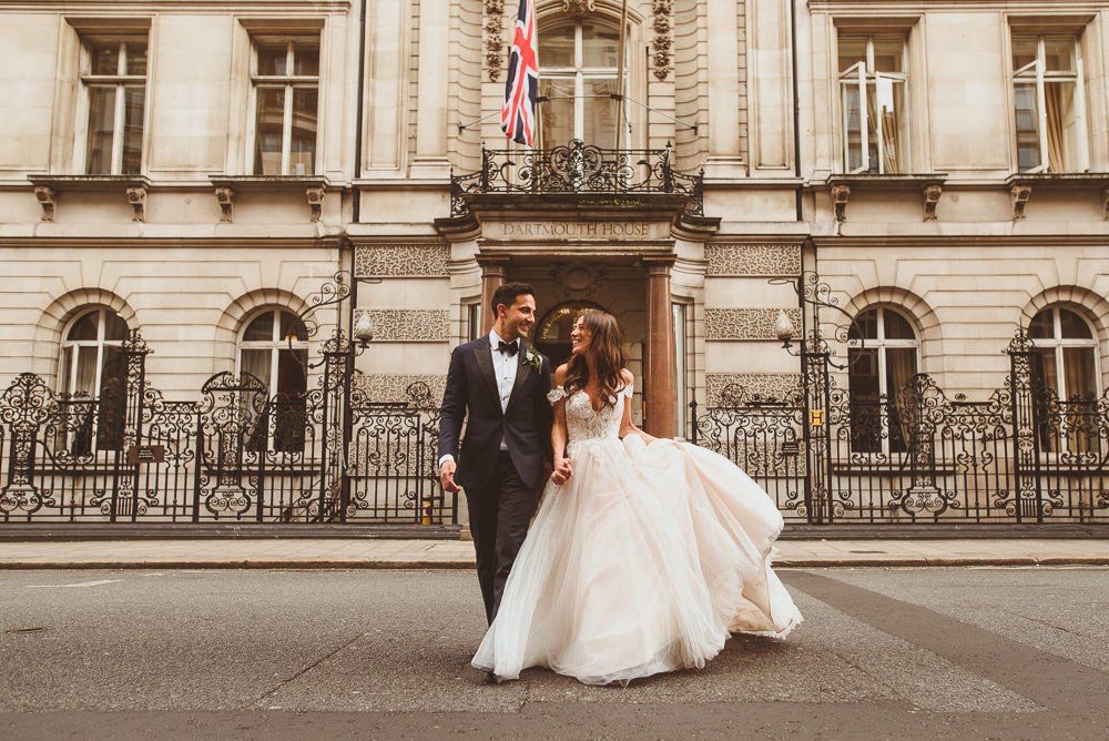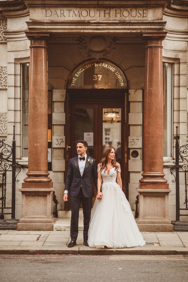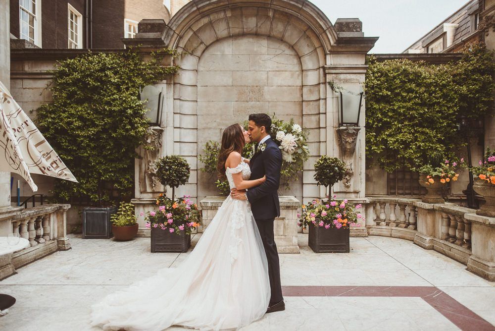 Finding the most perfect venue. We always said it doesn't matter where we get married as long as it's a little 'bit of us'. This took us to villas in the Italian hills, to mid-century halls in Derbyshire and Kent, our hometowns, to London where we both live and adore. When we found Dartmouth House we both fell in love - it's right in the heart of Mayfair and yet feels really secluded. I love the rich history it has, a London townhouse of a Lord, with striking original features. But my favourite part - the Italian courtyard out the back, complete with water fountain and lemon trees. Was thrilled to find somewhere we could be in the sunshine - hugely important to me! It felt so special to be in the city we love and yet feel like we were in an exclusive sanctuary of grandness and sunshine with all our family friends.