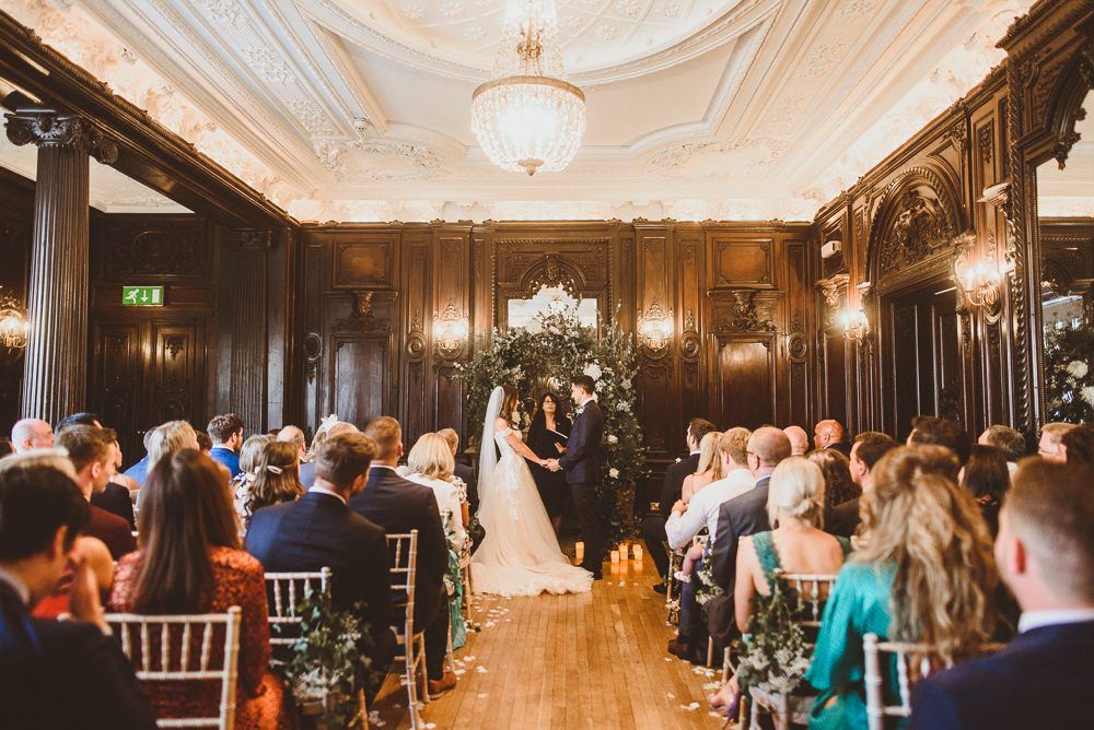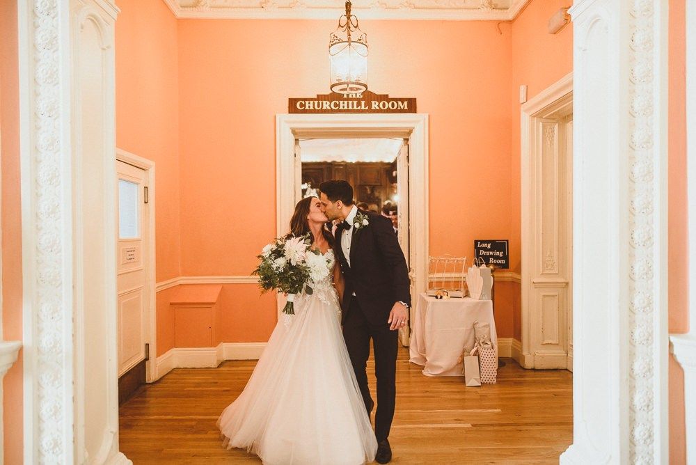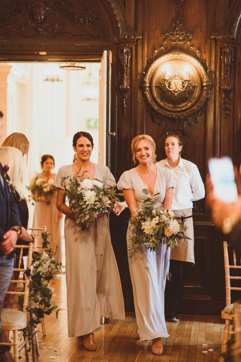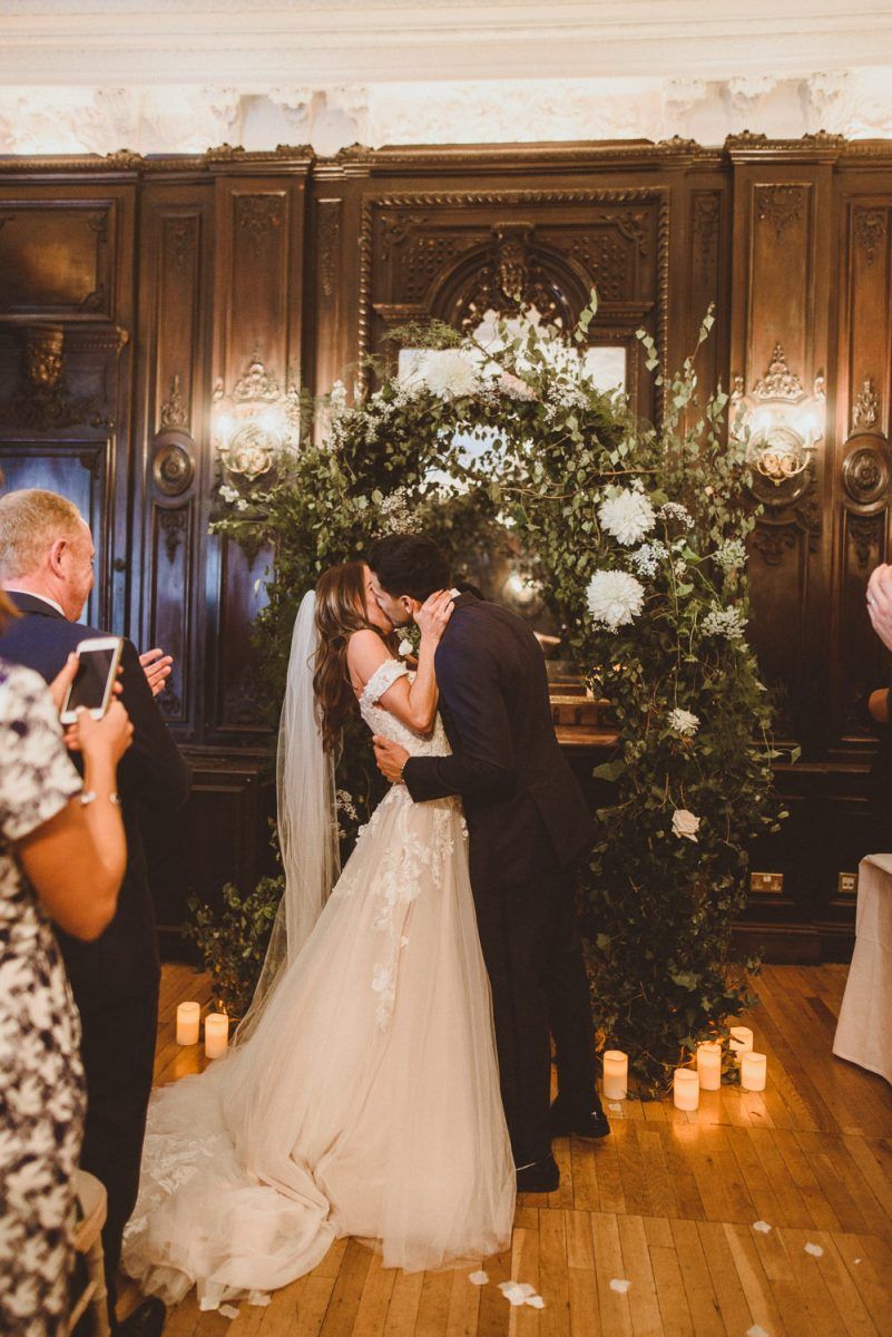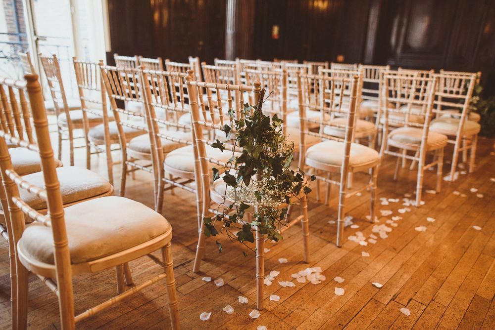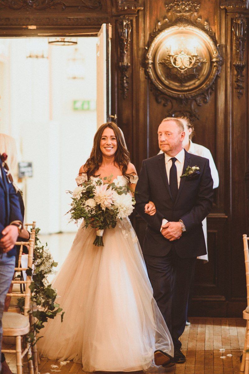 Although we weren't looking for somewhere we didn't need to do much to in terms of decorating, Dartmouth House happened to be such that we didn't need to do too much to change it, just enhance it and put our own twist. The vibe was botanical/art deco. So lots of greens & leaves plus white/cream/peachy flowers to bring it to life. We had foliage up the stairway and my favourite - a huge foliage arch at the top of the aisle. We wanted to show our playful & adventurous side in the flowers & small touches. I love pineapples (I was dressed up as a pineapple on my hen) so they featured subtly e.g. the name cardholders. We named the tables after our favourite Michelin restaurants as we go to one for every birthday and anniversary.
