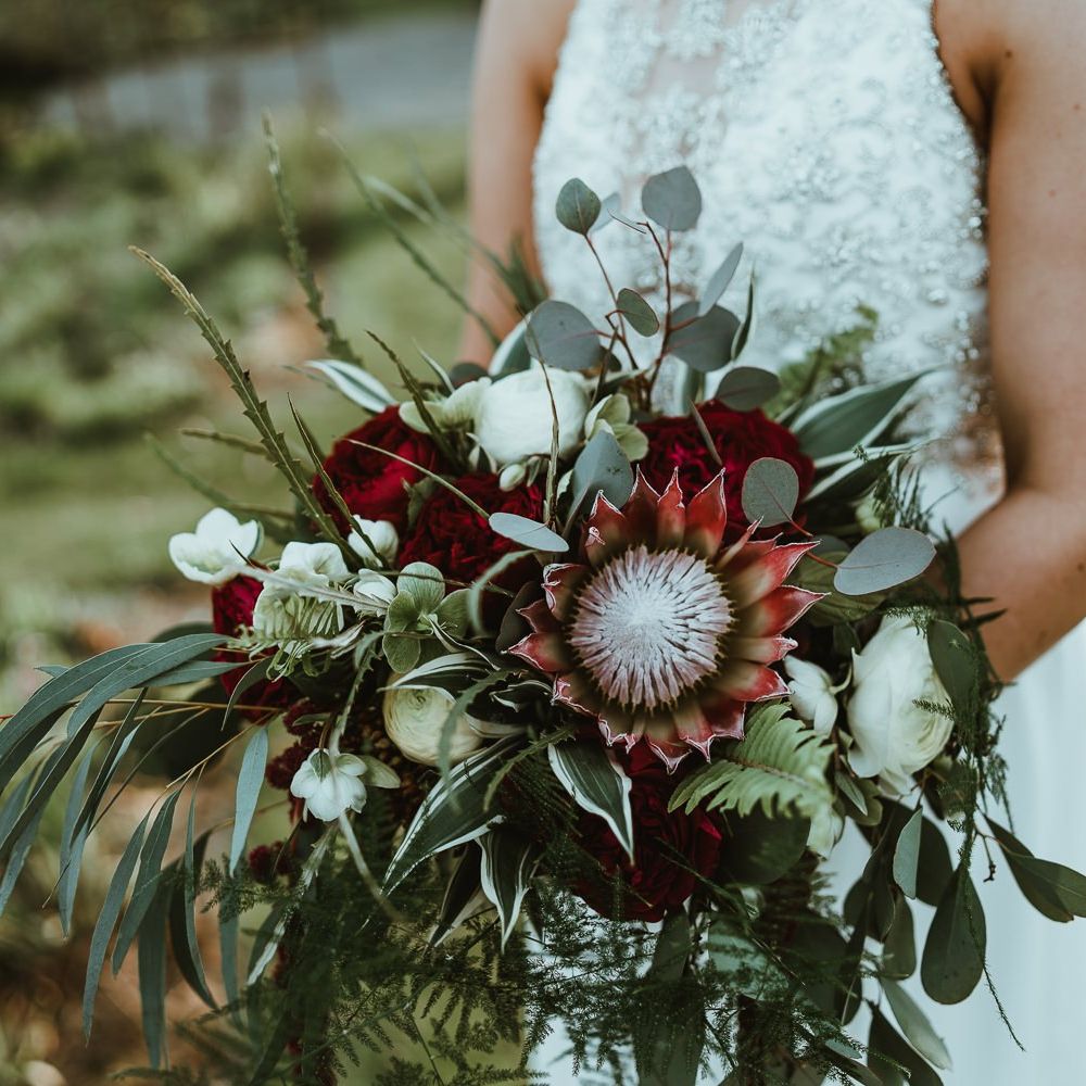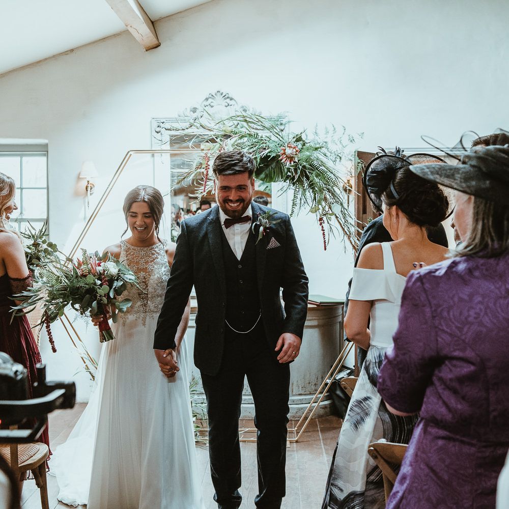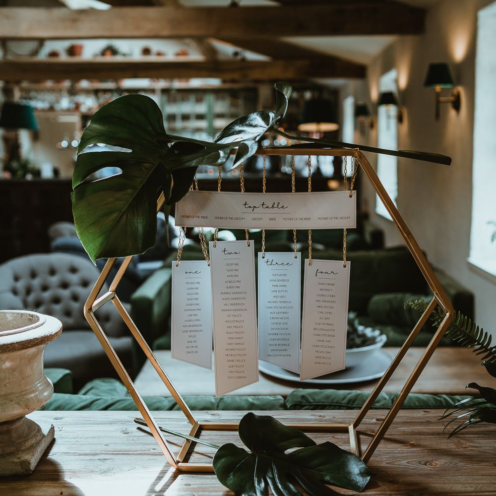 Boho-glam was our wedding vibe. We wanted the day to feel relaxed and the venue to be enhanced with natural beauty by filling it with flowers and foliage. We chose to have gold accents running throughout, which added an element of sophistication and glamour. Like most brides, I browsed Pinterest when searching for inspiration, but got creative by introducing modern, geometric gold structures. The hexagon moon gate was the star of the show, entwined with foliage and flowers, giving height to the floral arrangements that flowed throughout the venue.