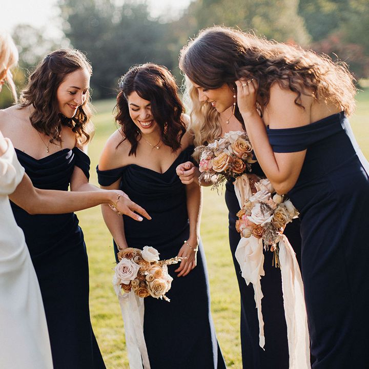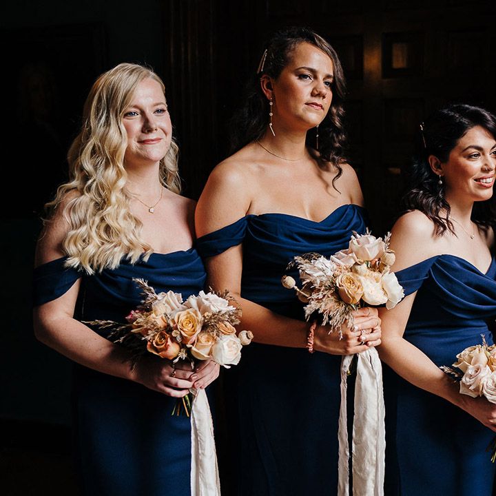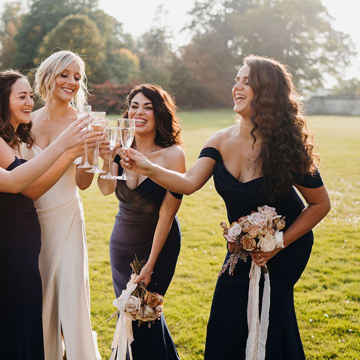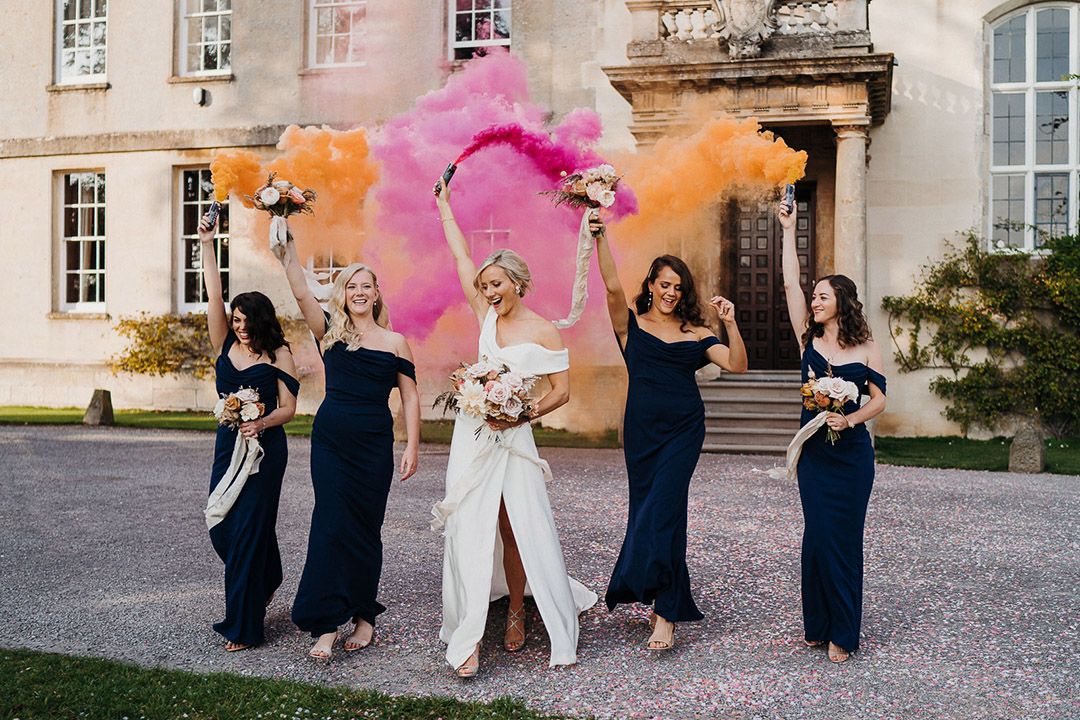 Bride and bridesmaids in navy blue dresses take part in smoke bomb photoshoot for wedding