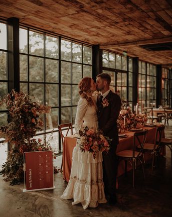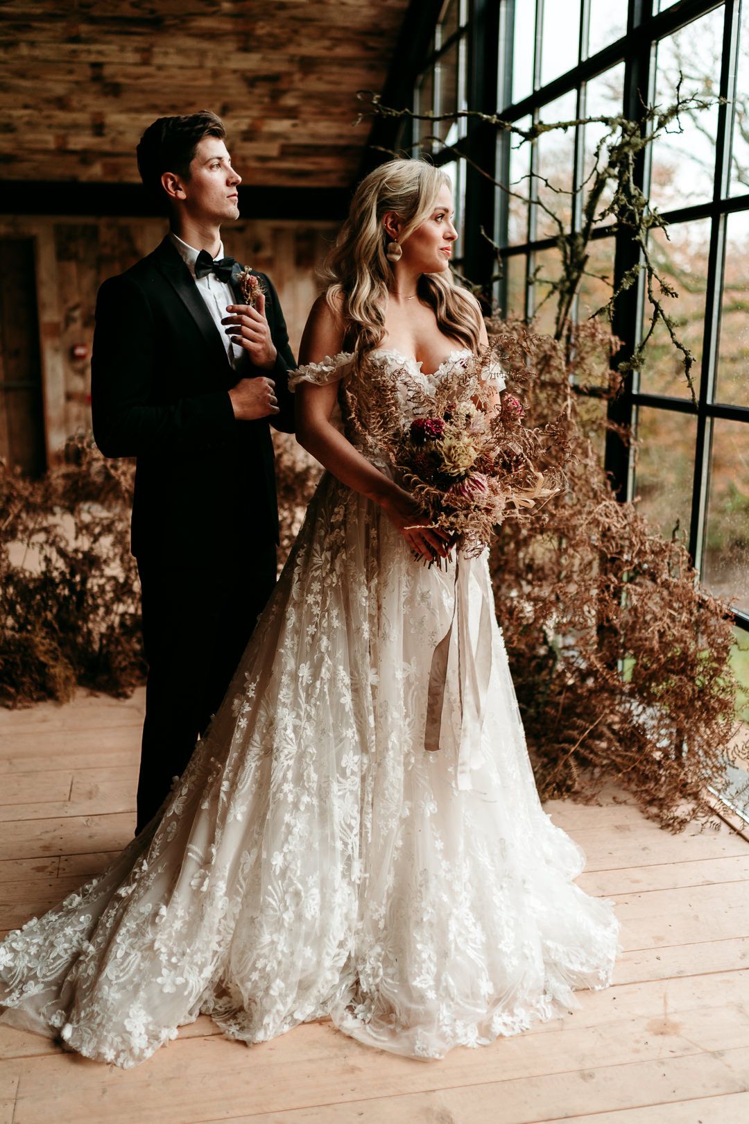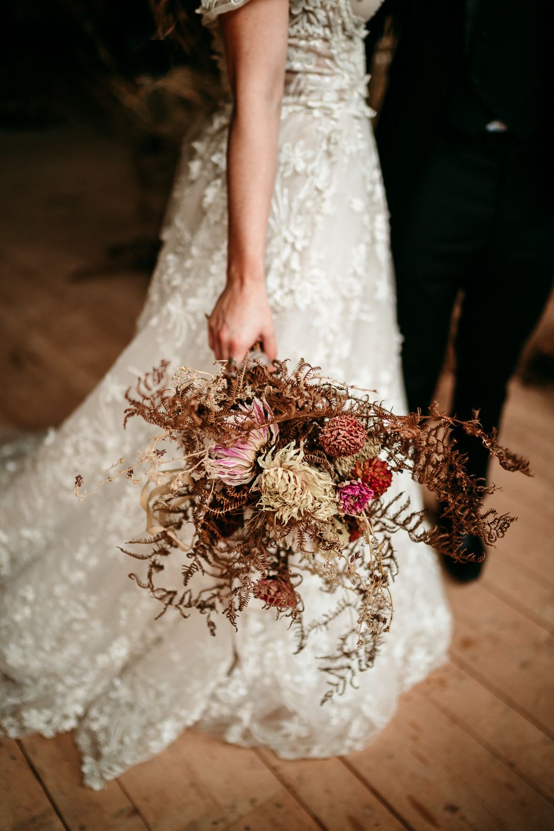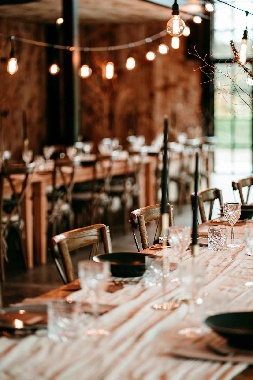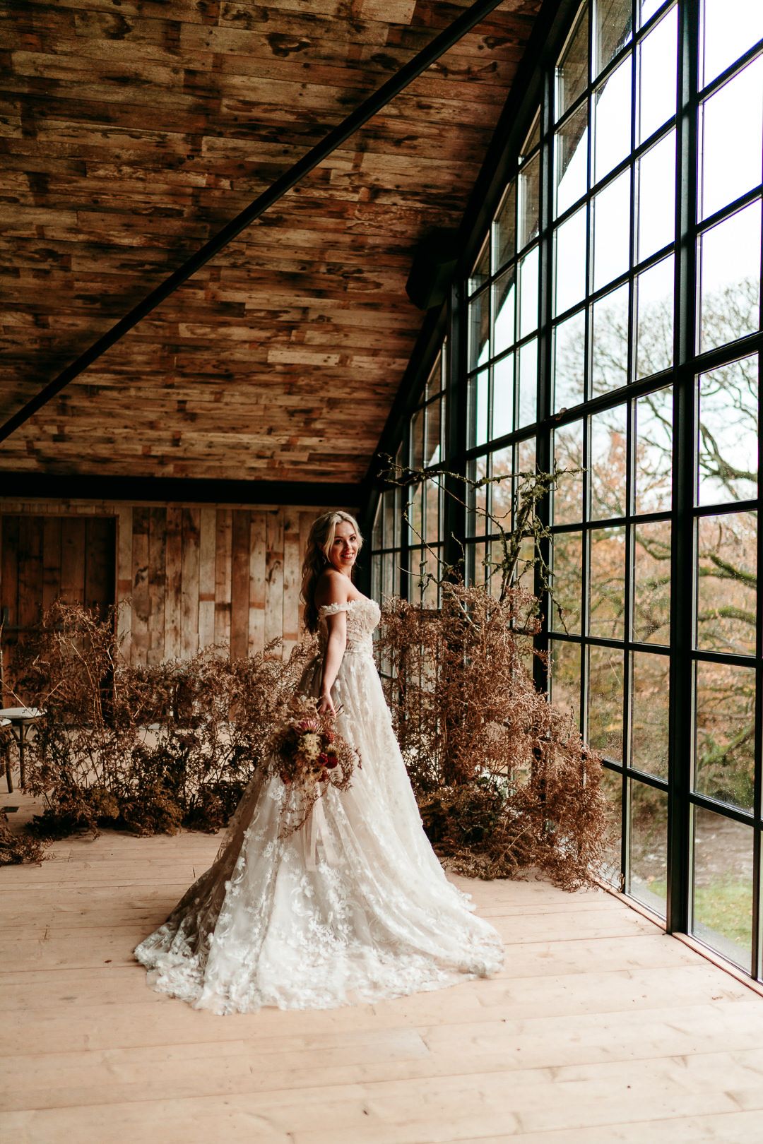Hidden River is set in a beautifully untouched corner of the Cumbrian countryside along a winding river. The styling for the shoot at Hidden River was very much inspired by the venue and the season. The stylist wanted to incorporate the textures of dried materials and florals and show that a darker colour palette can be just as beautiful, in the right setting.