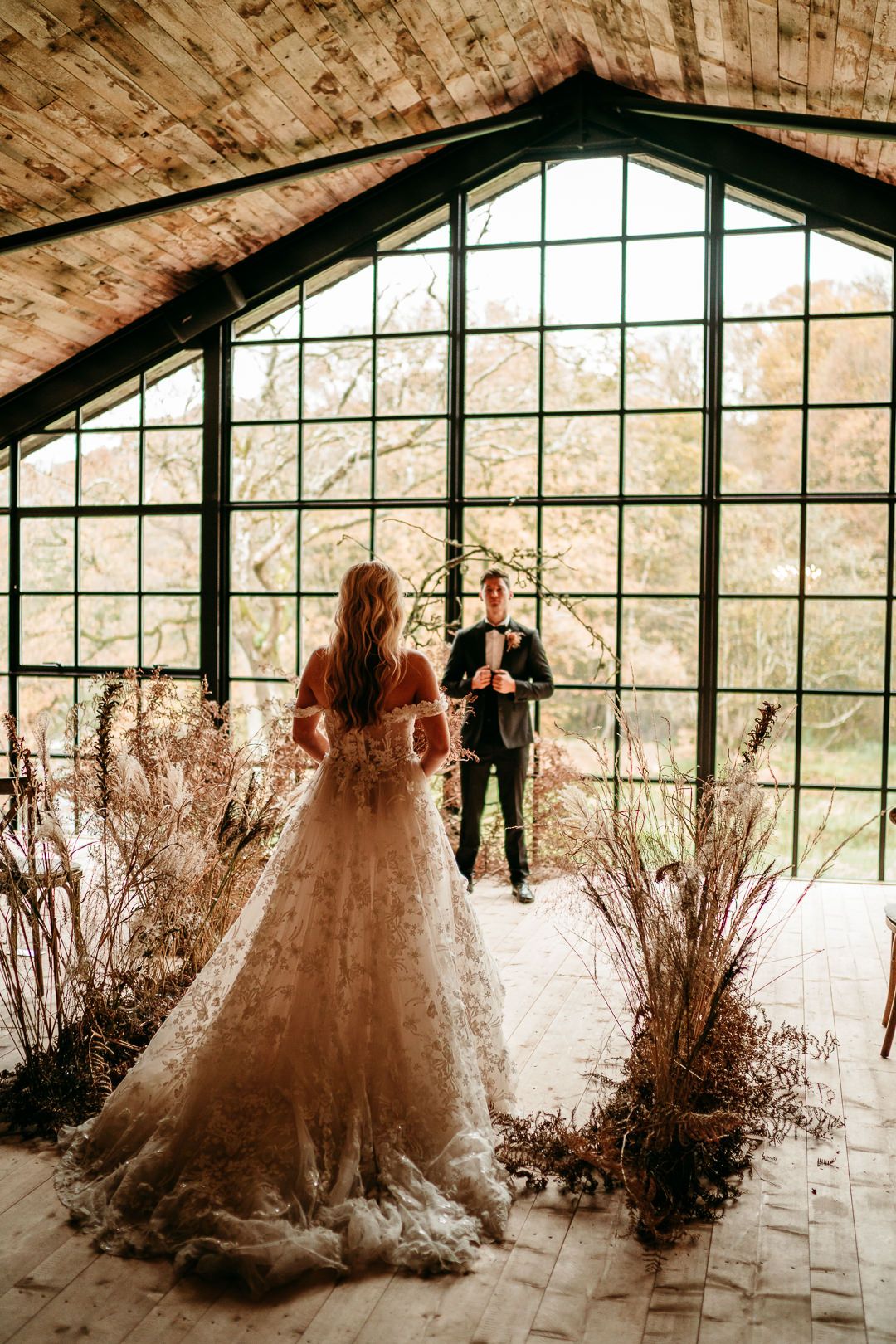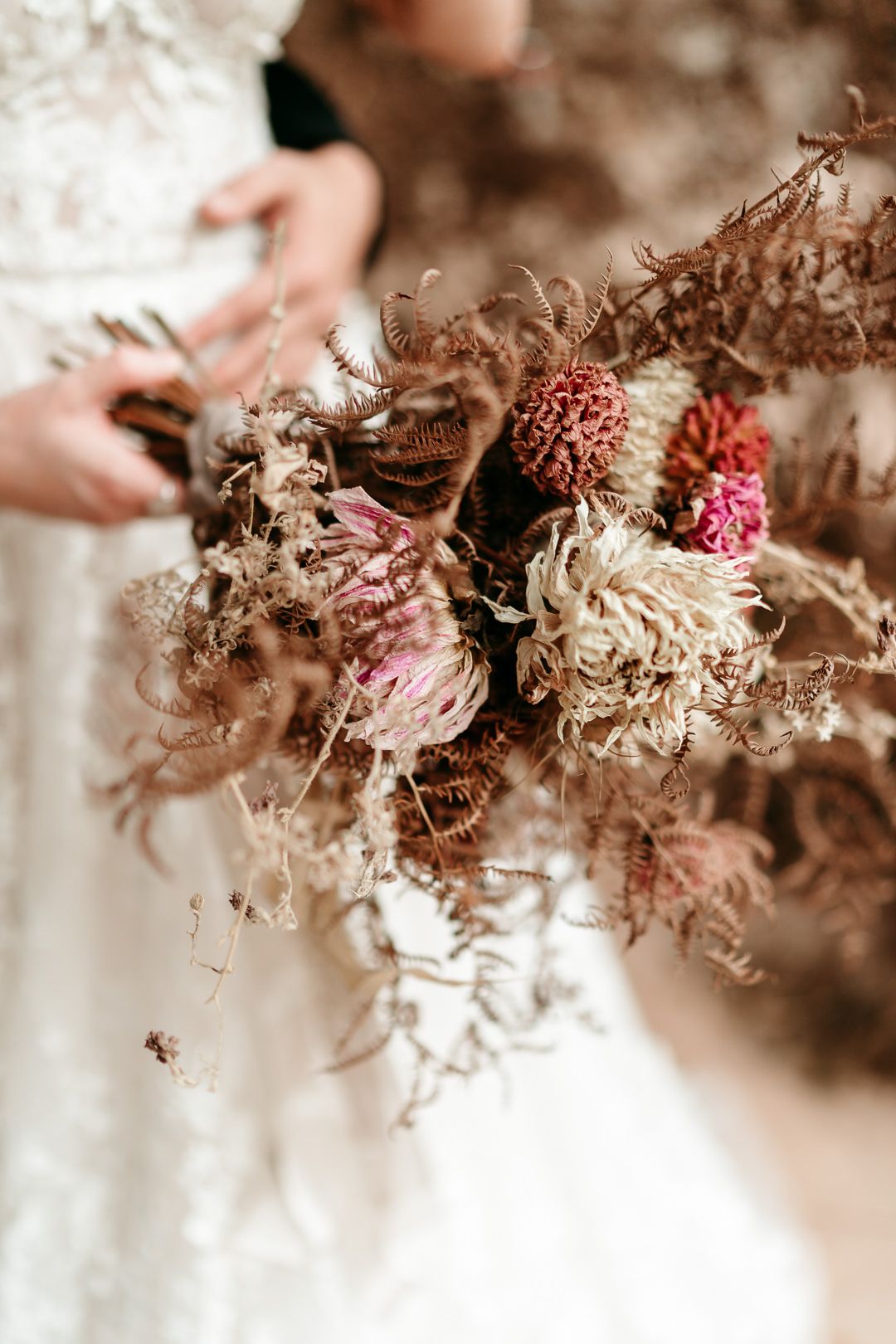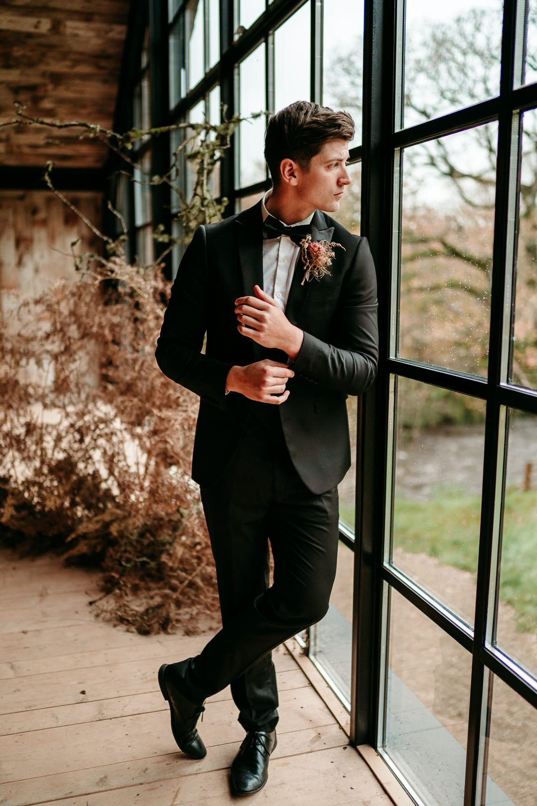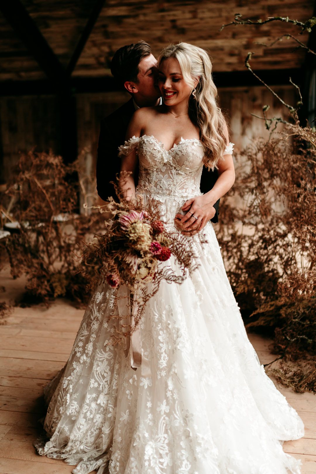 Hidden River is set in a beautifully untouched corner of the Cumbrian countryside along a winding river. The styling for the shoot at Hidden River was very much inspired by the venue and the season. The stylist wanted to incorporate the textures of dried materials and florals and show that a darker colour palette can be just as beautiful, in the right setting.