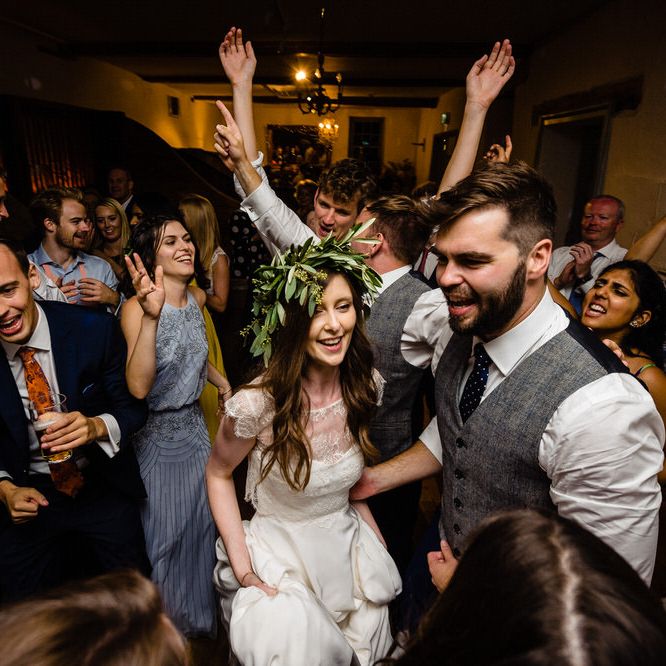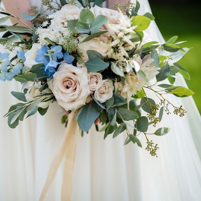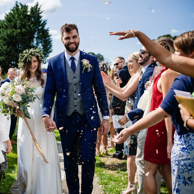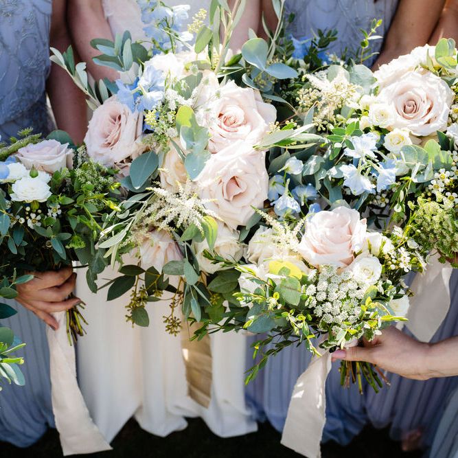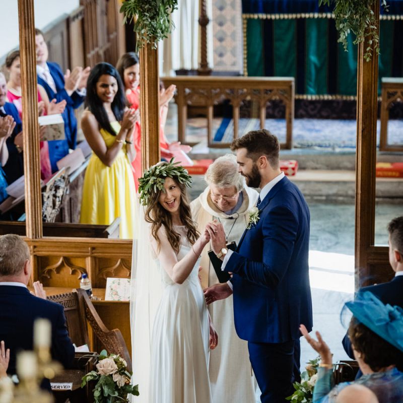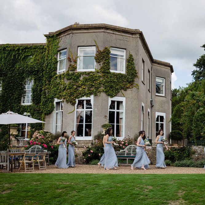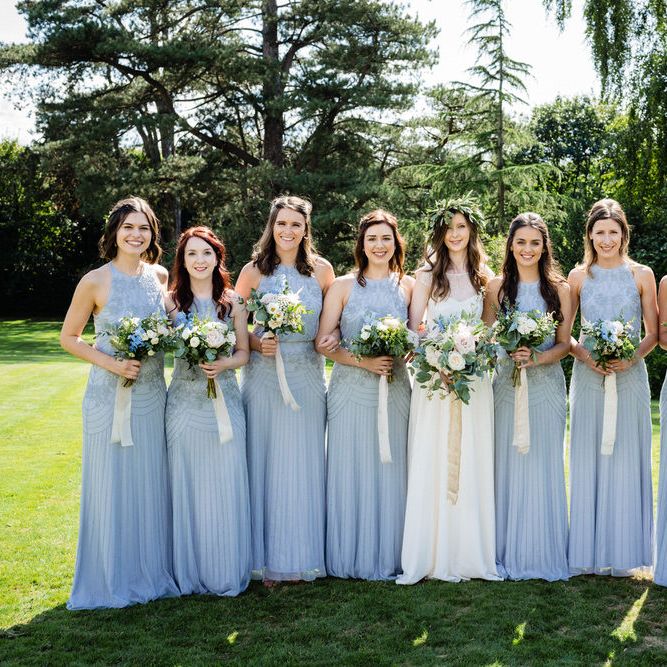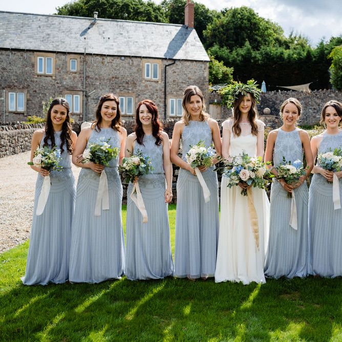 I found my wedding dress at Perfect Day Bridal in Bradford Upon Avon. The shop is beautiful and the girls who work there made me, my Mum and Granny feel so welcome! I chose a Charlie Brear dress with a separate French lace top and cathedral length veil. I wore my Mum’s rose gold bracelet, which she wore on her wedding day and Bob’s Mum bought me gold earrings. With eight bridesmaids – I originally thought I would get the girls to choose their own dresses in a similar shade and then found these dresses from Monsoon which they all loved and looked amazing in!