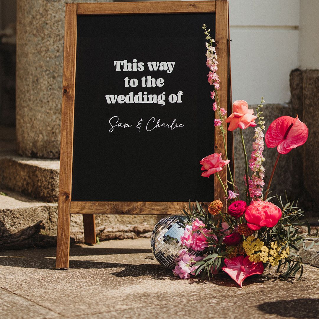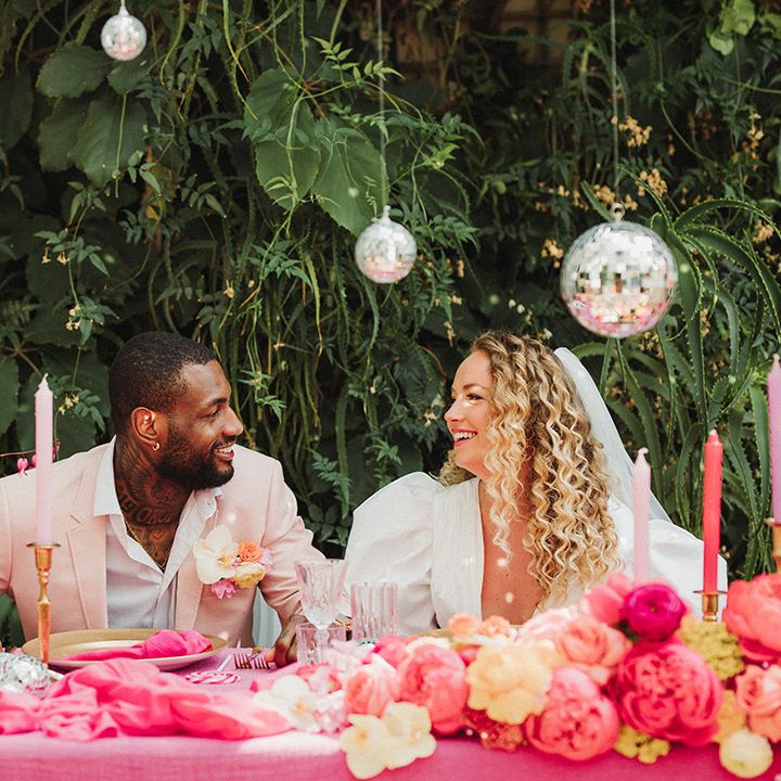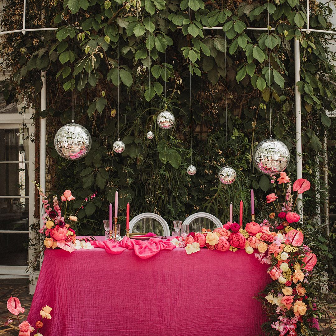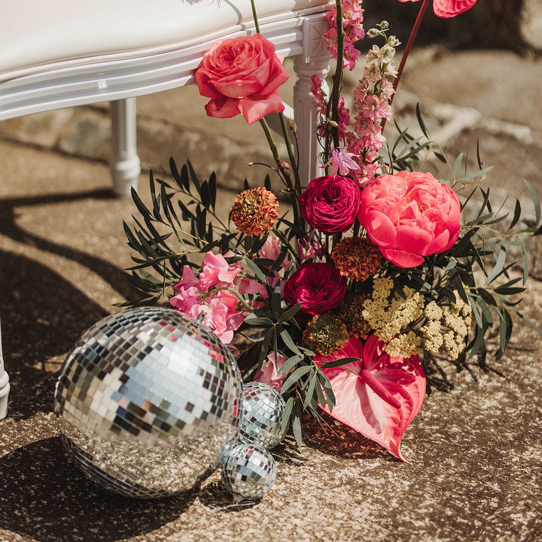 We included disco balls in our table set-up and biodegradable confetti canons full of colour for that extra wow factor. The wedding cake also reflected the style of the shoot with disco balls and bright pink colouring.