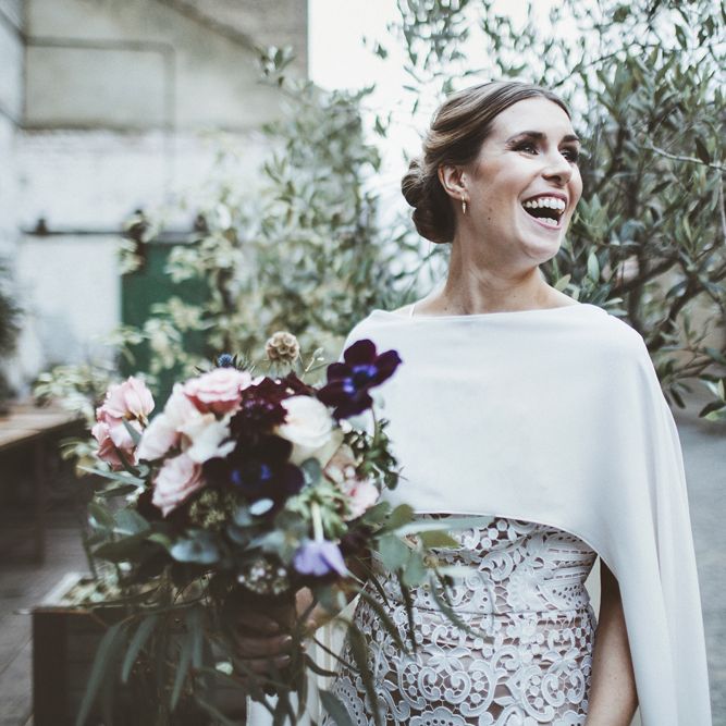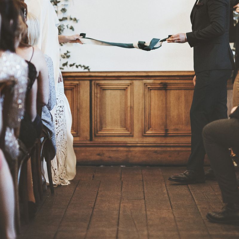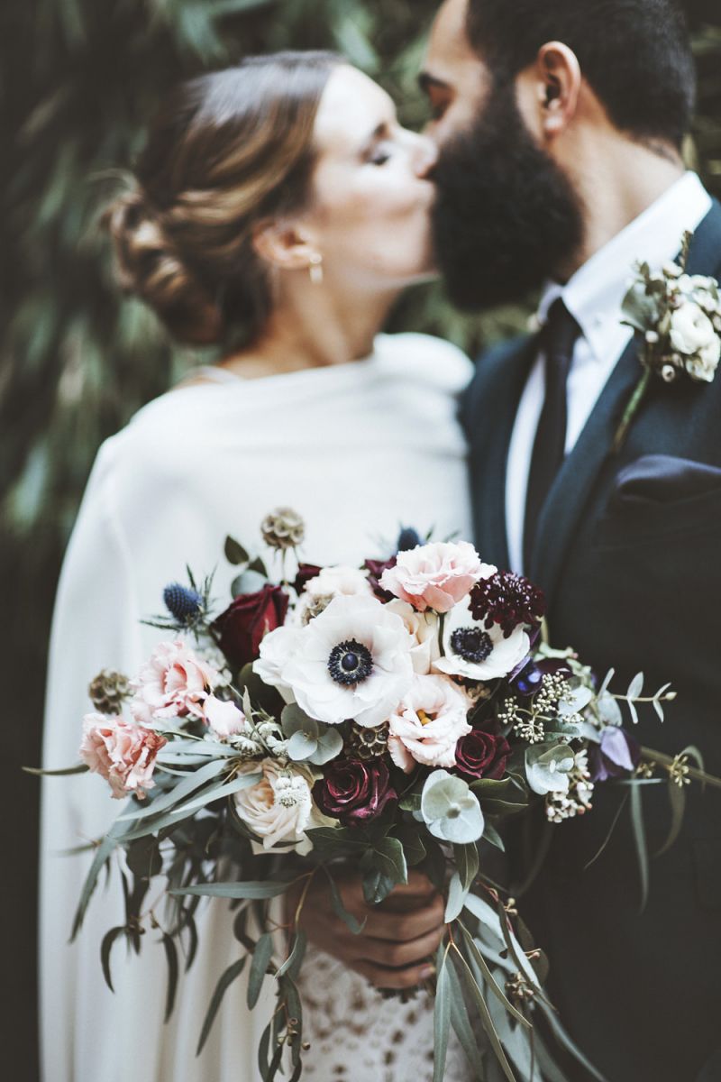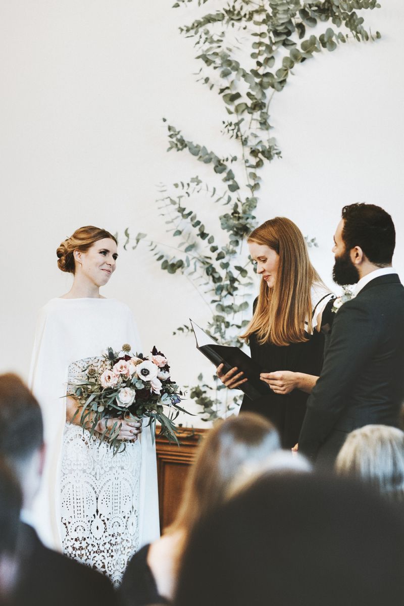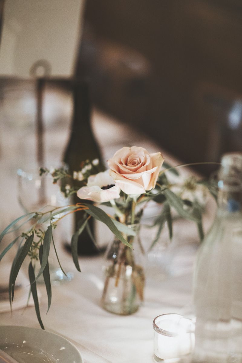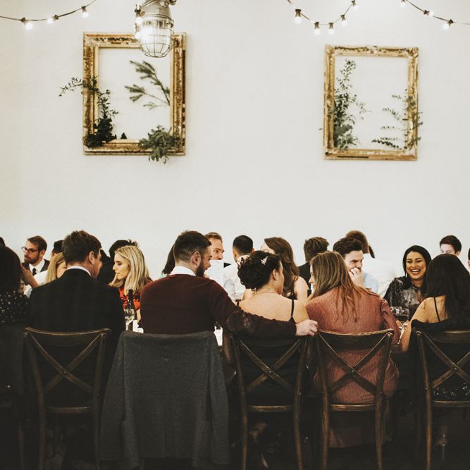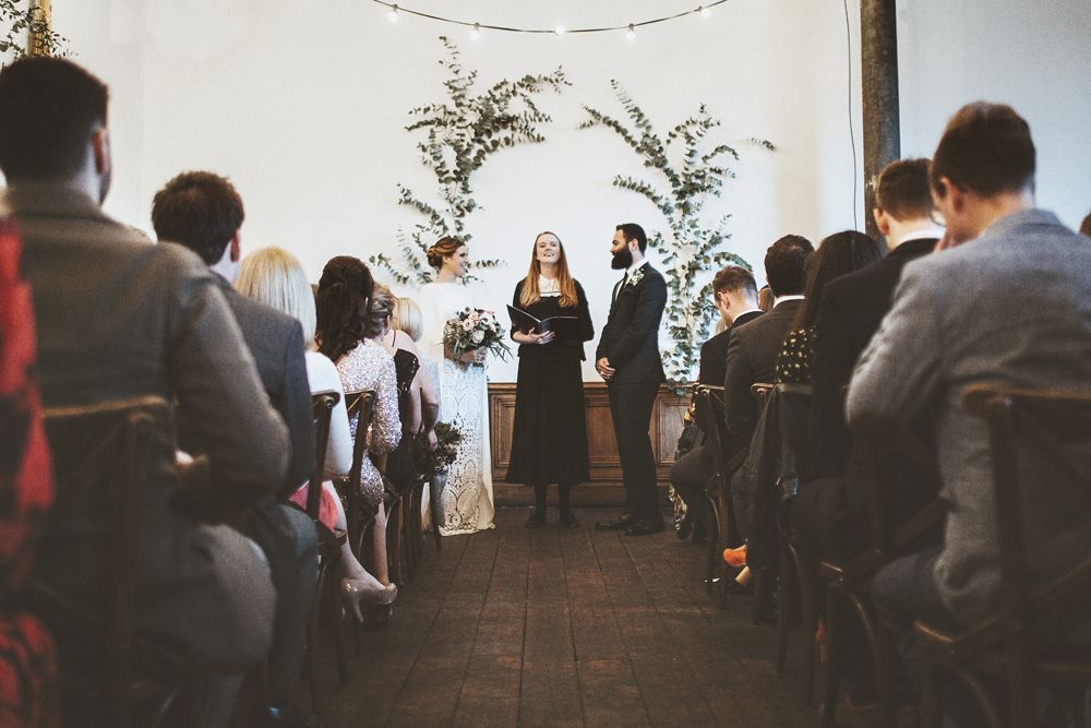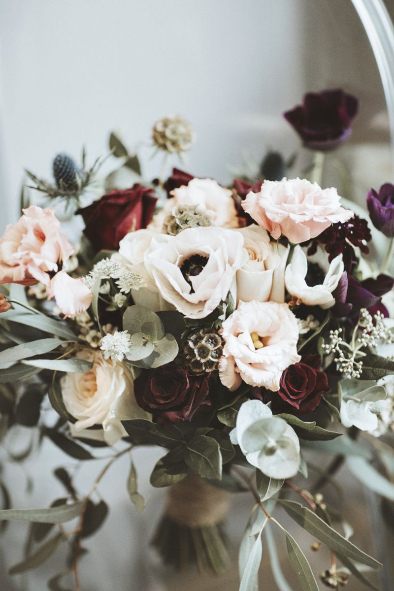 We wanted our day to be cosy, relaxed and super intimate. The venue has so much character that we just went from there. As it was a December wedding, we went for deep jewel colours with a bit of sparkle, and the rest of the styling just fell together from that. We both knew that we wanted lots of greenery and warm lighting. We suggested an asymmetrical arch where we were having our ceremony and Lizzie ran with the idea, creating an incredible eucalyptus arch which really set the scene.