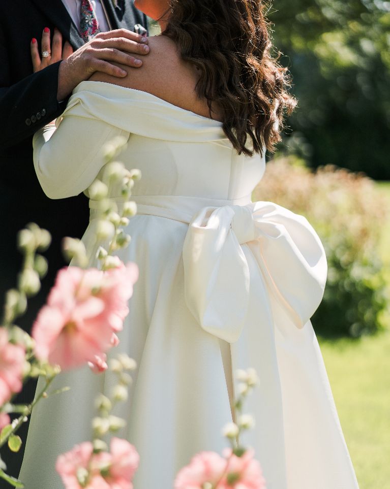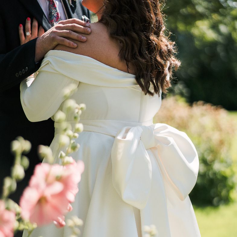 I am selling my beautiful wedding dress from Halfpenny London. I chose the dress from the Woburn Walk store and had it made to my measurements by their atelier over the road. I am a size 18 and 5 foot 3". My wedding outfit is: Okotan corset with sleeves - made from a BEAUTIFUL Silk Crepe, it has a zip closure and it is stunningly boned on the inside. Ellie Skirt - it has a zip closure at the back and a wrist loop underneath for help with dancing and getting around without the train being on the floor. ALSO... IT HAS POCKETS! Made from a luxurious Mikado. The Bow is now SOLD The dress was £5,355 when I bought it. It has been dry-cleaned and looks brand new, however, there are a few marks on the lining of the skirt, so it can't be seen but I just want to be transparent. I have the original receipt and dress bag.