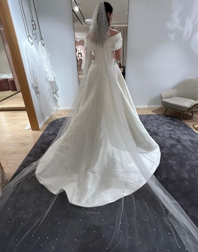 Unused (tag still on) Royal length I didn’t end up using it as I wanted a blusher, but this is the most beautiful veil ever. https://www.instagram.com/reel/ChP8irBgzpy/?igsh=anQwcmhleDE5NG5s