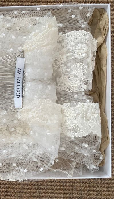 Stunning fingertip veil by designer AM Faulkner. One of a kind design, boxed & unworn. I went with a longer veil so this has only been tried on. I love it so much but it really needs to be worn and not sat in its box! 140cm wide, 90cm long Embroidered French illusion tulle with a metal comb.