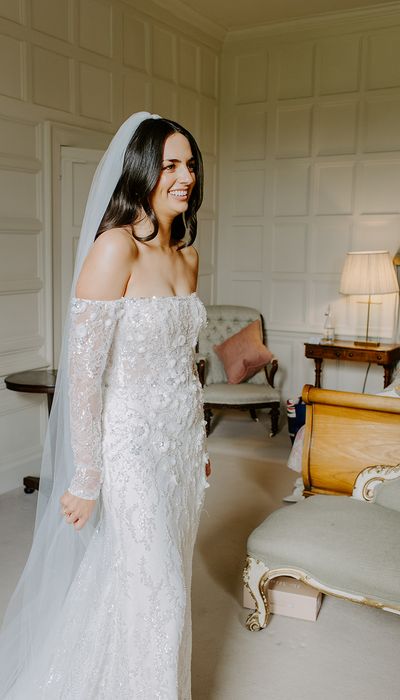 Tender long-sleeved off-the-shoulder mermaid wedding gown made from a lace covered with sequins and 3D floral applique. Featuring a straight neckline, long sleeves, a semi-transparent embellished bodice, lace-up closure on the back, and a skirt with a short train.