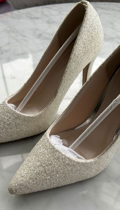 Crafted from ivory snow glitter, this sky-high court has pointed toes, a contemporary, streamlined shape and elegant stiletto heels. Bought them for my wedding that was in May and only wear them on that day. Size UK 6 EUR 39