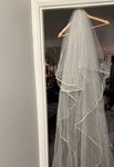 Stunning Cathedral length veil. Jewels all over. Ribbon on the hem. I got so many compliments on my veil all day of the wedding.