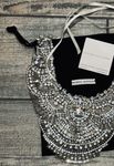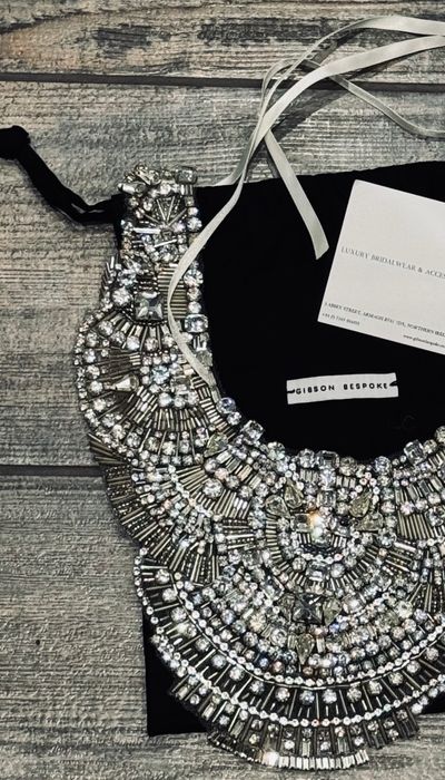 Gibson Bespoke ‘Astaire’ couture crystal bridal necklace. Brand new with tags and dust bag. Smoke-free home. Bought for a styled shoot and never used. Approx size: 24cm at the widest point, 28cm long (not including ribbons) - each ribbon is approx 45cm long.