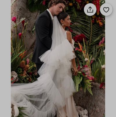 Two-tiered veil with ruffles along the edge of a veil made of soft tulle. Veil attached to comb, sits comfortably. Ivory. 108 cm long. Worn once. Brought from Etsy.