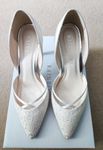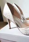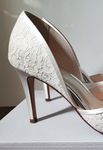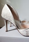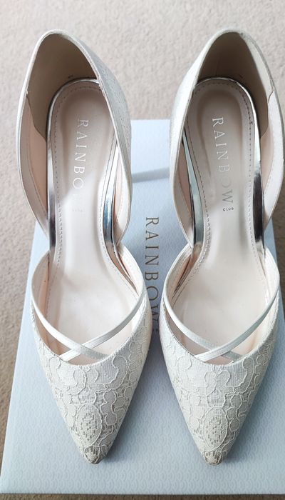 Worn once on my wedding day for a few hours. No signs of wear and in pristine condition. Brand: Rainbow Club Heel height: 9cm / 3 1/2" Fabric: Exclusive Ivory Satin & Luxury Lace Sole material: Resin Rubber Lining material Synthetic Dyeable fabric