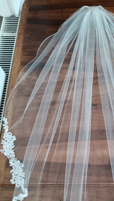 Long ivory coloured wedding veil. Used only once for my wedding. Has a modern lace detail around the bottom of the veil. In very good condition. It has a comb attached to it - easy to put into your hair. Also has a veil hanger, as seen in the photo. Has a protective bag for transportation.