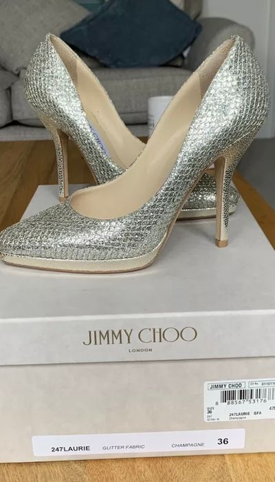 Jimmy Choo Laurie Shoes Size 36 in "champagne glitter" upper. Discontinued style, these are incomparable and a rare find these days - especially in such excellent condition. These Choos come carefully packaged in their original box with the original purchase receipt from Bond St store, London as proof of authenticity. Purchased originally in 2015 they have been worn only once for a wedding ceremony, and have been carefully boxed up and stored since then. These shoes are in excellent, almost as-new, condition with no marks, scuffs or imperfections of any kind on the upper, heel, lining or visible sole.