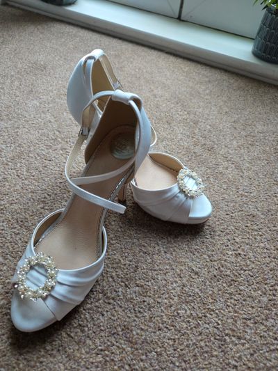 Crafted in luxury ivory satin this brand new style features a pleated vamp, dainty crossover straps and a high stiletto heel, finished with a beautiful pearl and crystal brooch at the front. The hidden platform, cushioned leather insole and supportive straps provide wear-all-day comfort.