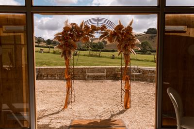 Wedding arch used for our wedding day mixed of dried and fake flowers, burnt orange and cream. 2 x Corner arch piece, L shaped 80cm by 80cm approx. 50cm width. £150. Can be attached with cable ties. Burnt orange cloth also available. Collection only. Metal arch not included.