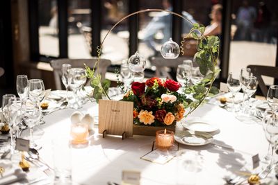 10x 50cm gold hoop centrepieces secured on a wood base with 2x glass baubles with tea lights, artificial arrangements with roses and eucalyptus, mixture of pink/purple tones and orange/browny tones-flowers are in oasis, oasis is sat loosely on the wood so you could replace with other flowers