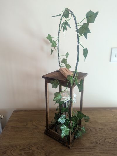 Table centrepieces with tall wooden stand, metal hoop with fake ivy and fairy lights, and cardholder for table name (or similar) Also includes black shadow vase and fake white roses in base.