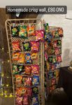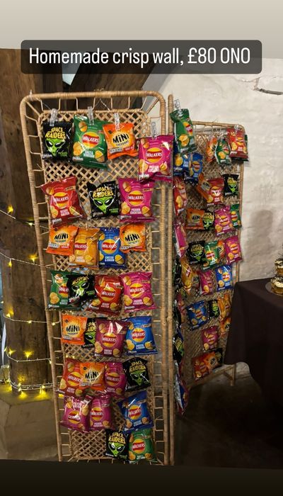 Crisp wall homemade with a room divider still on sale at ikea for £99. This can also be used to peg up photos. It has gold strings across with little pegs and one row of fairy lights pegs across the top. We estimate it cost £120-£130 to make. Any questions please get in touch.