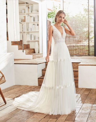 Be your bohemian self in the Cami Gown, a gown made for brides looking for simple wedding dresses with an abundance of spirit. Playful brides will appreciate the deep plunge neckline, which is perfect for flattering the bust. An intricate beaded lace body draws the eye towards the waist, whilst a free-flowing tulle skirt cascades downwards in a feathery manner. A sleeveless, A-line design will help to balance out curvy figures so you feel like the best version of yourself on your special day. An illusion back adds a splash of frivolity and lace panels run in tiers down the length of the floaty skirt for that added touch of charm. I bought this dress in a sample sale. I ended up having a change of heart and going for a different Rosa Clara dress for my big day. This dress has never been worn - only tried on. It is also unaltered