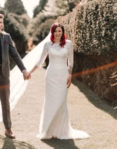 This dress is an absolute show stopper. I felt amazing wearing this dress and so many people commented on the intricacy of the lace detail and the beautiful keyhole back. There are hidden buttons on the back of the dress to pin the trail up for when you are ready to party and want to throw some shapes on the dance floor without worrying about tripping over it! ;) I can't fault this dress, it fitted like an absolute dream with no alterations necessary (high street size 8), and it came with some padding in the chest to give me a bit of an hourglass shape, which was perfect because I have quite an athletic build. There is a hidden tie-up corset in the back too which really made my silhouette look stunning. It has a gorgeous vintage feel about it while still being timeless, I will be sad to see it go but I'd love for someone else to look and feel as special as I did on my wedding day. It is in perfect condition, I had it professionally dry cleaned the day after the wedding and it has been kept safe in it's bag ever since. I am open to reasonable offers.