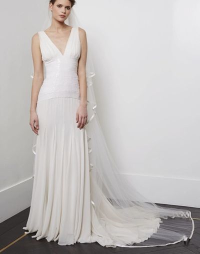 Stunning Amanda Wakeley 'Venus' wedding dress, never been worn. New sample. Gorgeous silk dress with sequin feature panel to the middle chest and waist. Simple, elegant, classic design. Size 12 (more similar to a size 10) I was going to dress with ostrich feather cape (shown in the image) not included in the sale.