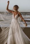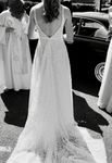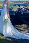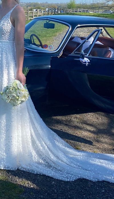 Made with Love Louie Flowey wedding dress. Beautiful 3D lace covering the dress. Fitted low V top with thin straps and A line skirt. The dress is split sizing to fit size 8, 32d bust. Made with love sizing Size 2 bust Size 6 waist Size 6 hips Perfect condition and has been professionally cleaned. The dress was altered to have the straps slightly shortened and length of the dress shortened. I am 5ft5 and wore 8cm heels.