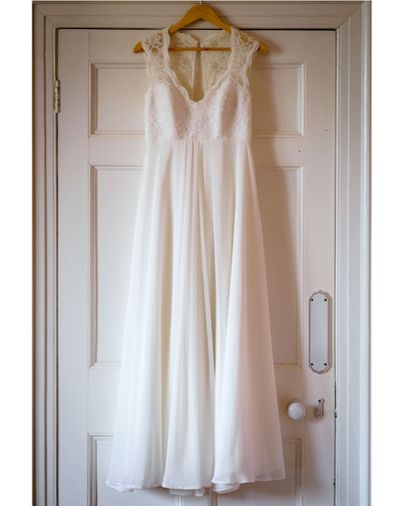 Empire-line chiffon wedding dress. Length has been adjusted and hem has been french-seamed. Wedding was May 2023. Dress has been professionally dry cleaned. I am 5ft 4 and dress just skimming the ground.