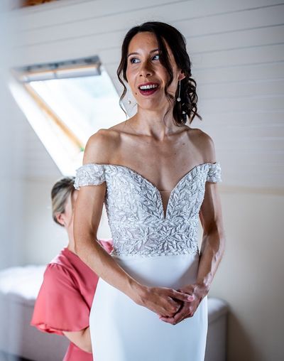 Selling my beautiful Justin Alexander signature dress, Westfield, which I wore for my wedding in summer 2023. Ivory fit and flare style dress, super flattering as it cinches in at the waist. It has intricate beading to the top in a gorgeous leaf/floral design with an off the shoulder style. It has a cathedral length scalloped cutout train with delicate beading. It is made from a crepe material with lace accents on the train. It also has gorgeous button detailing all the way down the back. The label says US size 6 which is UK high street size 8. I’ve only had the length altered. I am 5ft6 and wore heels with a height of 2.4 inches. I did have a wrist strap and bustle option added which were incredibly helpful on the day, but they are not visible if you didn’t want to use them. Bought for £2,500 and have paid for professional dry-cleaning which was £220. In excellent condition following cleaning, ready to be worn again for someone else’s special day!