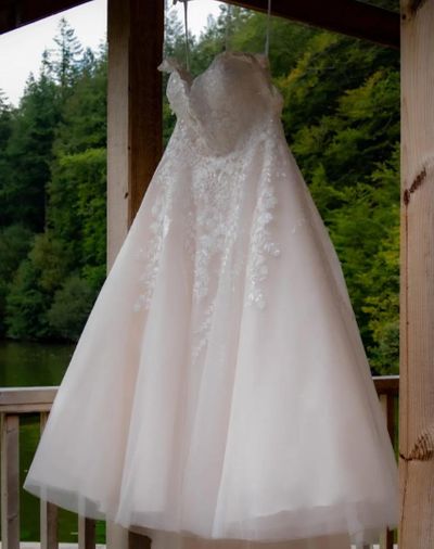 Size 18 princess wedding dress Off white lace shimmer look Comes with hoop and short matching veil Adjustments - Added lace to chest Length shortened