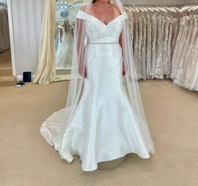 UK size 20. Perfectly fits uk size 16, however it is unaltered so could fit UK size 14-16. Brand new with tags. Beautiful Mikado satin fit and flare gown with stunning off the shoulder, sweetheart neckline. Buttons all down the back of the dress/train. Hidden zip fastening. Very flattering, timeless dress that could be kept simple or glammed up with belt/veil. Accessories not included. Photo included of me in a sample dress for an idea of how it fits a busty UK size 16.