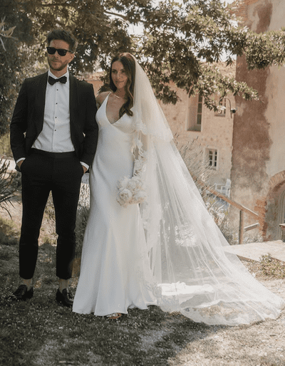 Satin slip dress by New York designer Jenny Yoo (Marnie dress) worn for my Tuscan wedding last month. Super flattering shape, thick satin fabric that skims the body and has a train- Sample size 6 which I'd say fits a size 6-8. No alterations to the overall shape at all other than a small amount taken from the bottom of dress - I am 5 foot 6 and wore 5-inch heels. Finger loop has been fitted to make it easier to walk/dance- but I actually barely used it as it was already very easy to move around in! This is a super flattering and very chic dress- would love it to go to a good home for a second wear! This has been cleaned but needs spot cleaning for a few small bits of discolouration on the very bottom of the train from grass. I wore the dress with a Mantilla-style Blusher veil which I'm also happy to sell for an additional £100 (Original price £180)