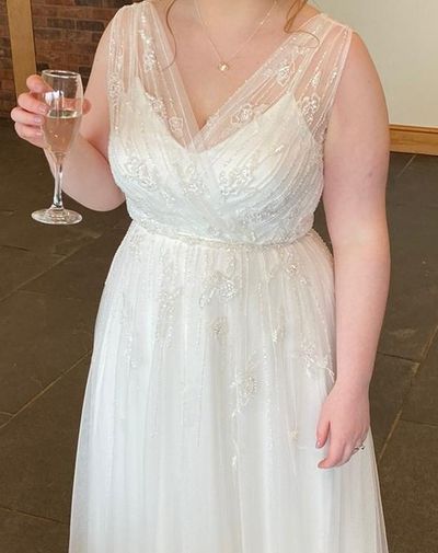 Size 12 - True to size (standard Size 12 not bridal size) Beaded tulle with a crossover bodice, comes with matching belt There are some marks on the underside of train (see photo) but can't see them from the topside of the dress The length has been altered: - Length from shoulder to hem on underskirt is 148.5cm - Length from shoulder to hem on tulle layer is 152cm