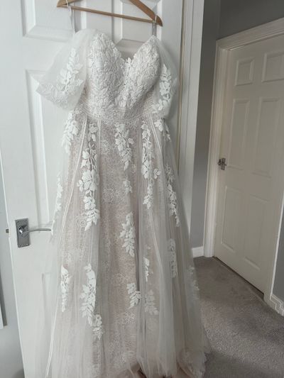 Essence of Australia plus size dress. Champagne colour. Beautiful delicate lace with tulle over top with floral appliqués over top. Size 22 (fits high size 18-20). Originally sleeveless but had custom off-shoulder drapes added. I’m 5”8 Long train Free cathedral veil (plain white)