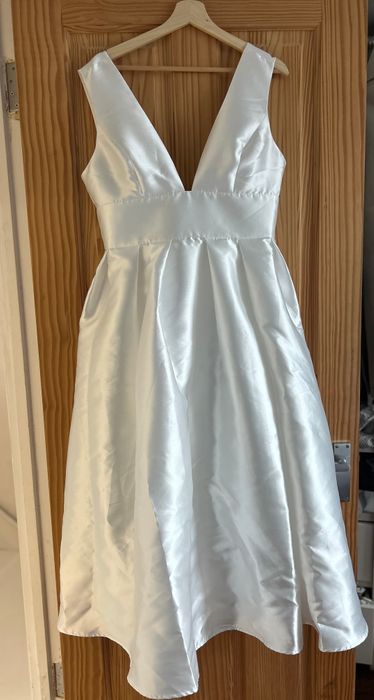 I couldn't decide between two dresses and missed the return. It is now sold out and cost £199 originally. It's a size 14, but it's a small 14, large 12. This clean-lined satin maxi dress skims the form thanks to its plunging V-neck bodice and wide, full skirt. Minimalist and chic.